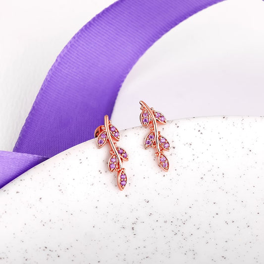 The Rose Gold earrings look like a leafy twig with very peri-coloured enamel and push-back closure.