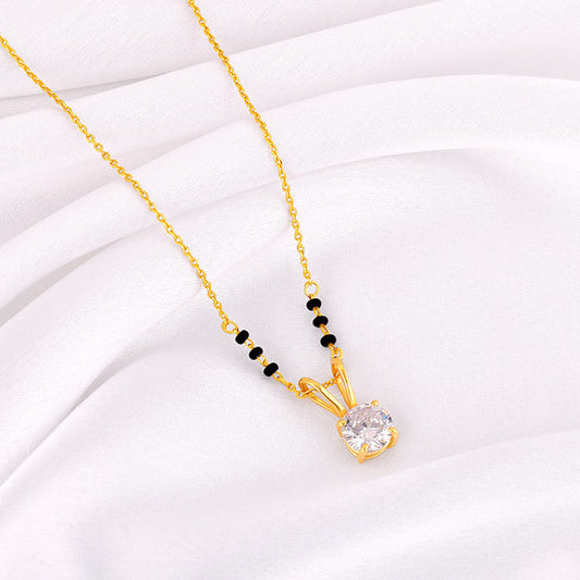 This golden mangalsutra features a circular zircon set at the end of a V-shaped motif. The chain has three black beads on each side.
