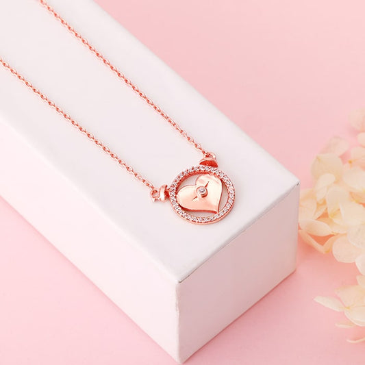 The Rose Gold necklace has a zircon-studded circular pendant with a heart in it.