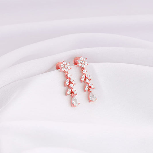 These rose gold earrings have a floral motif with floral element danglers studded with zircons.