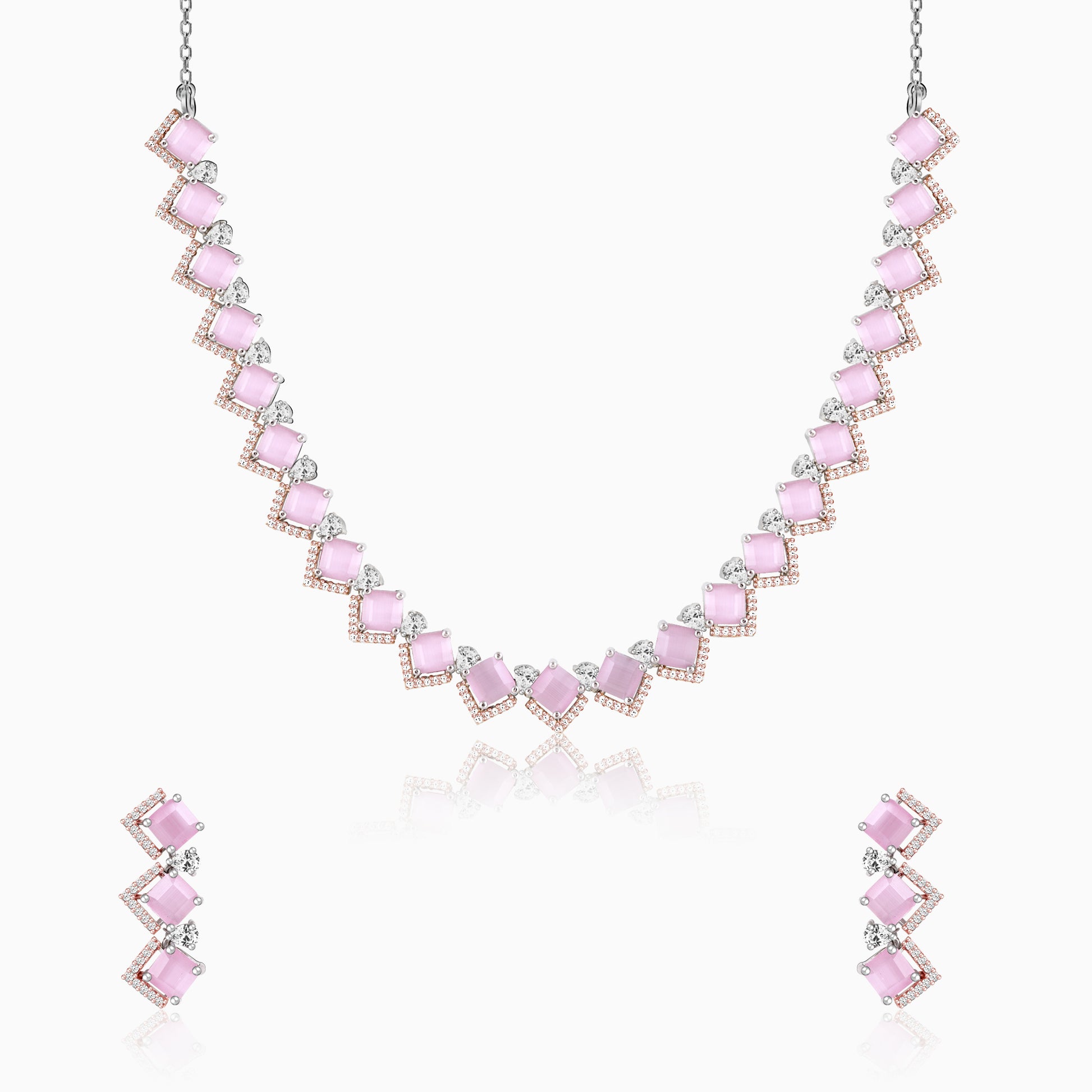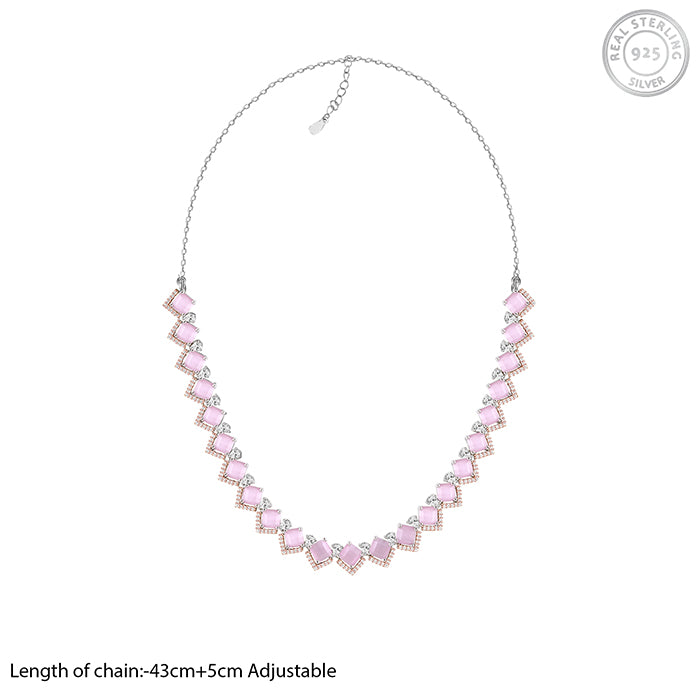 This silver necklace and earrings set has an alternate placement of dazzling zircons amidst the coloured stones giving it an ethereal look.