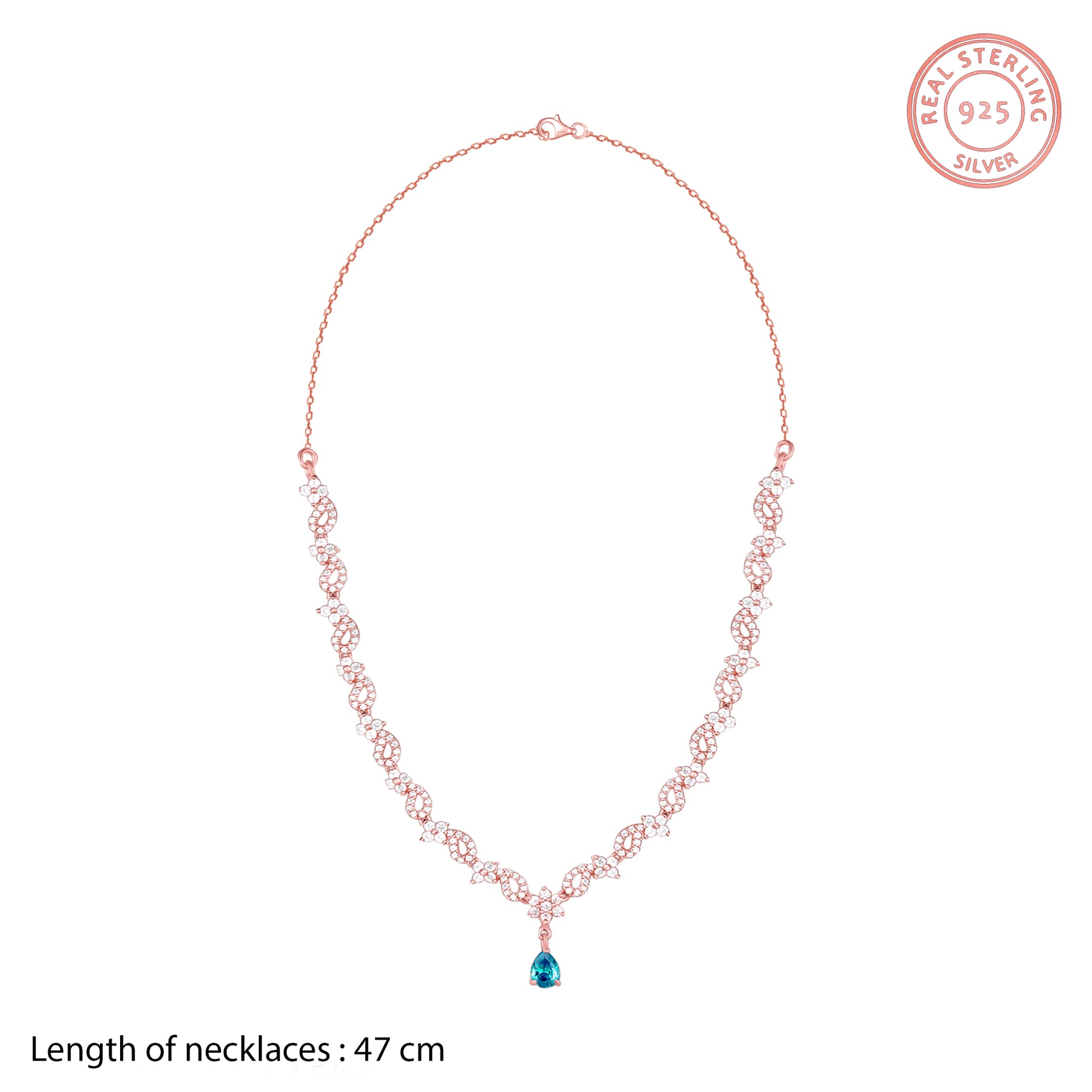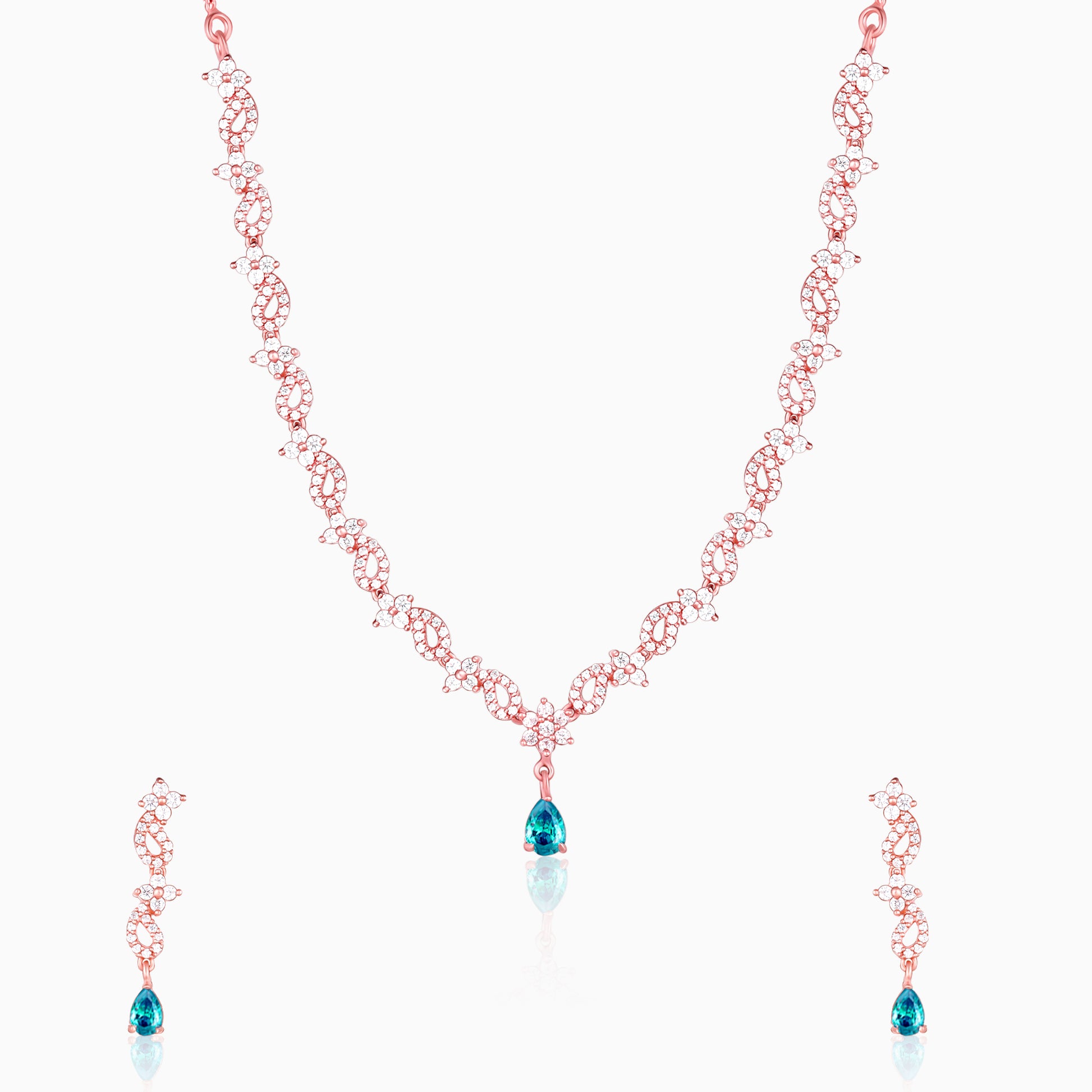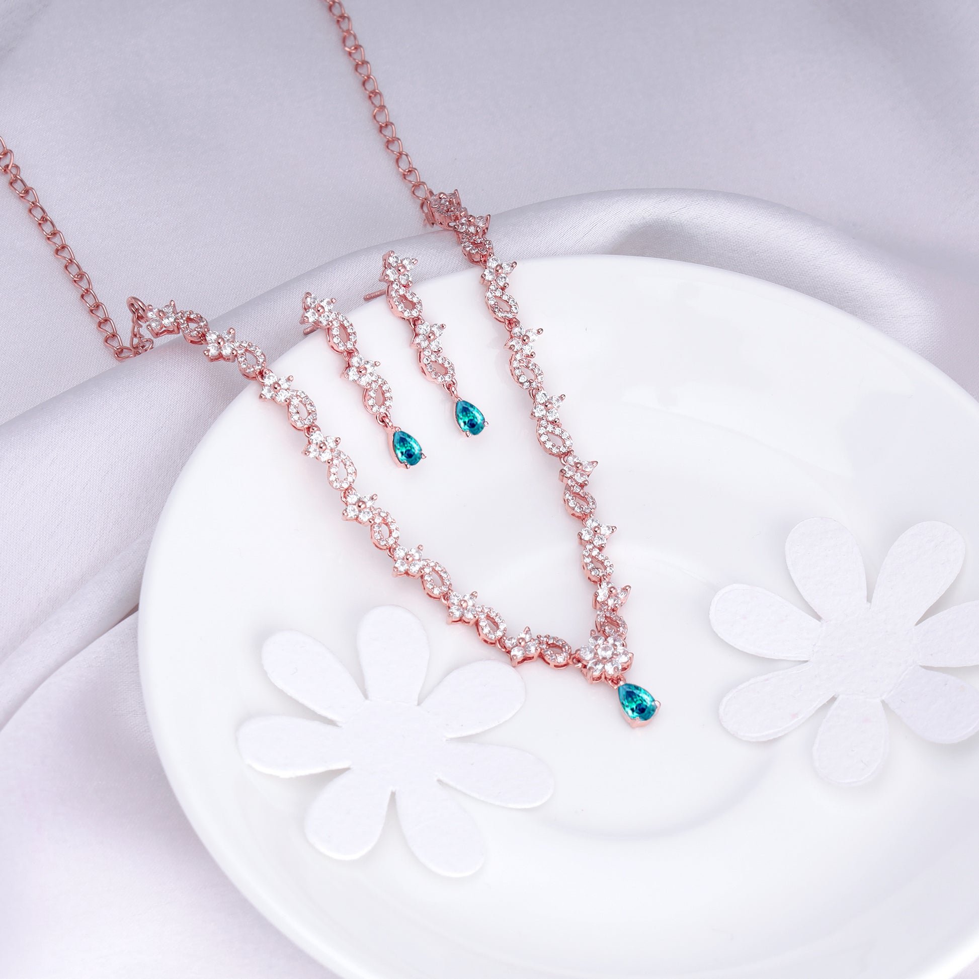The Rose Gold Blue Drop Set has an elegant design of a necklace with studded zircons, crystal blue coloured stone at the centre, and a rose-gold plating finish.