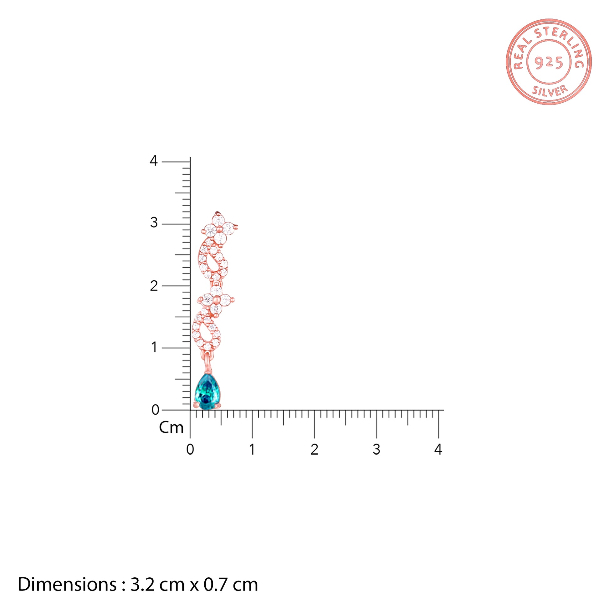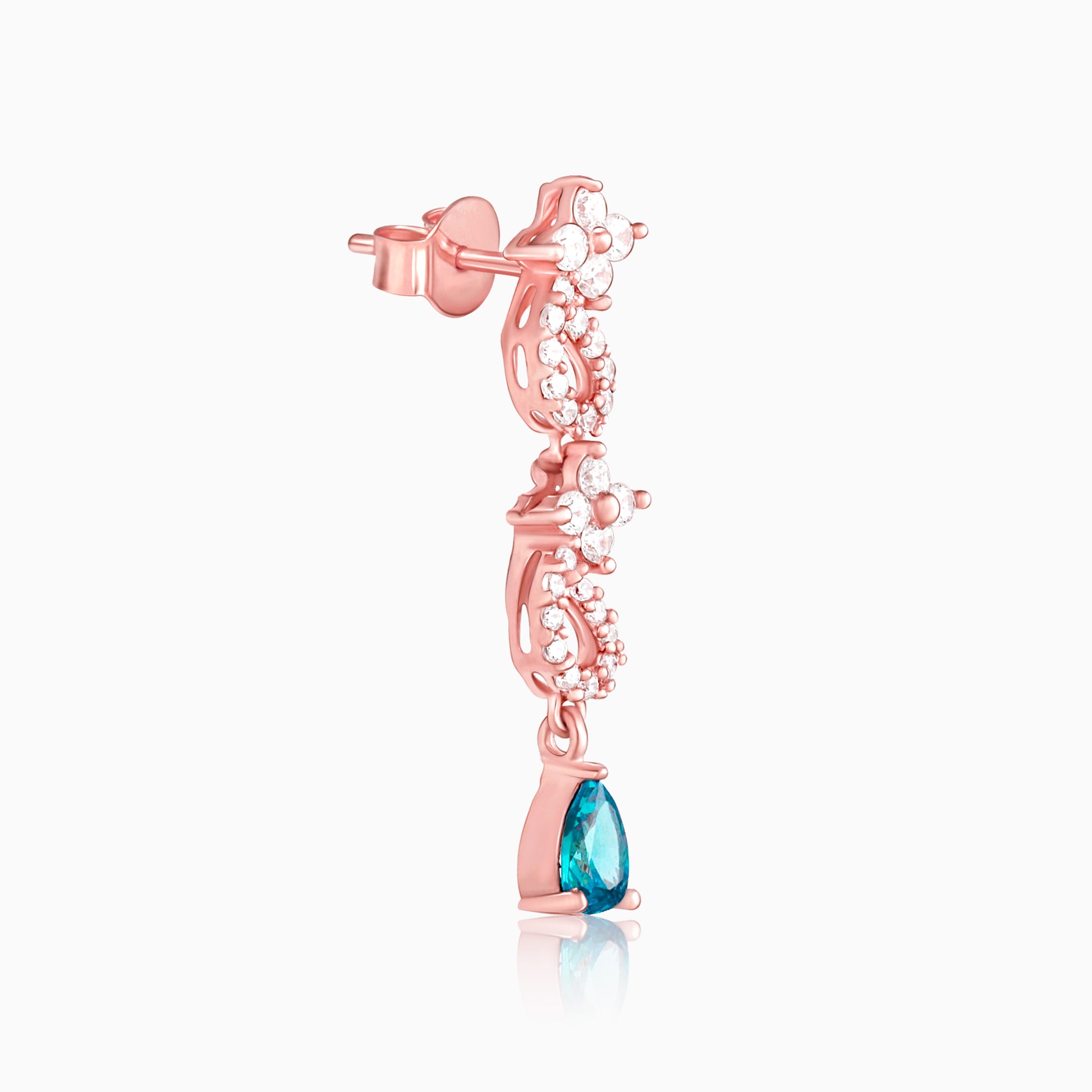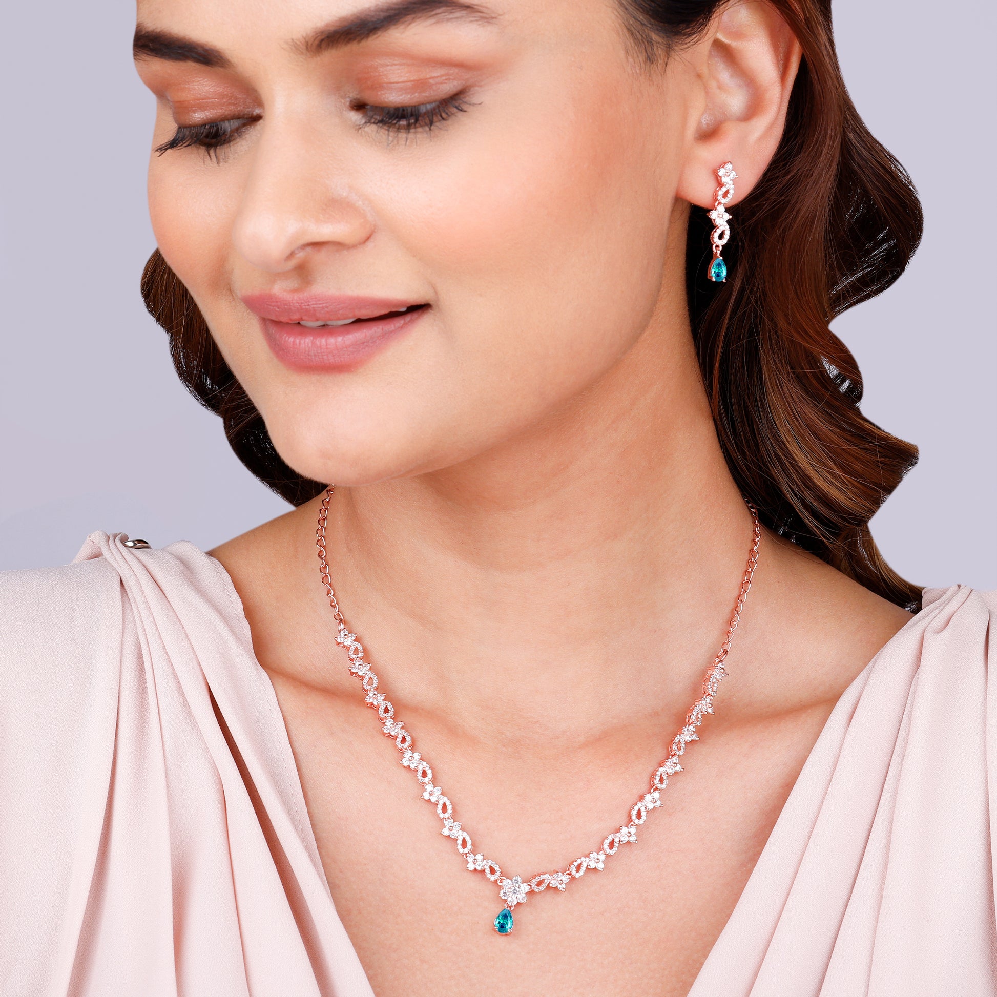 The Rose Gold Blue Drop Set has an elegant design of a necklace with studded zircons, crystal blue coloured stone at the centre, and a rose-gold plating finish.