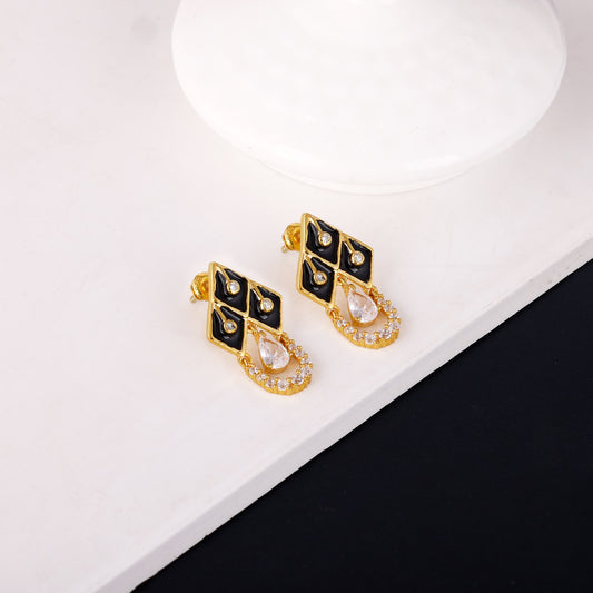 This golden mangalsutra has a wave motif with a unique design, studded with zircons, and suspended from a black beaded chain.