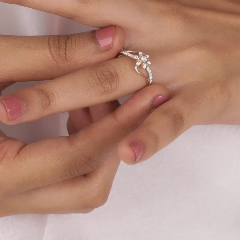 This ring has a flower motif with a classic design set with lab grown diamonds, and the band is also studded with lab grown diamonds.