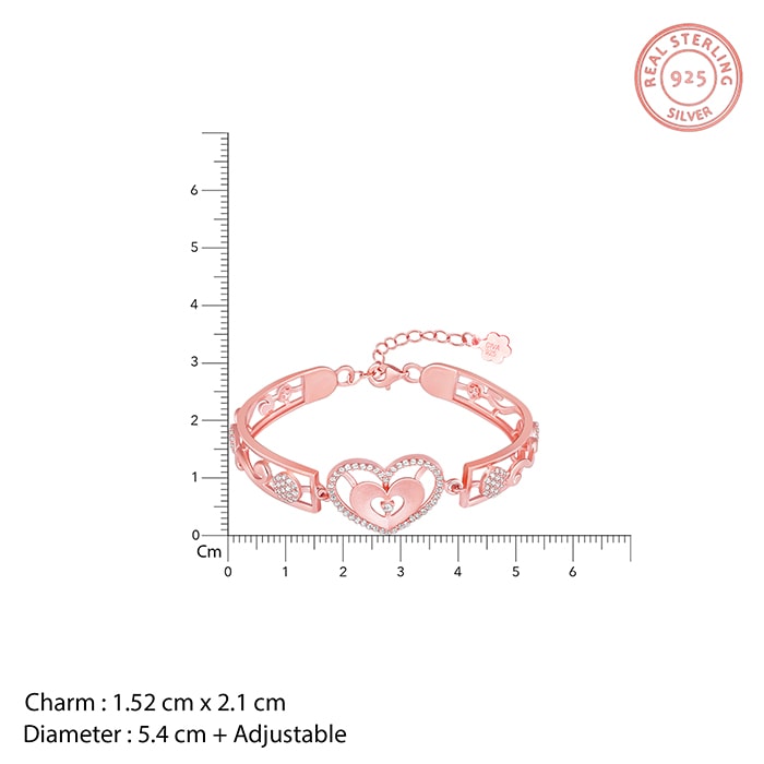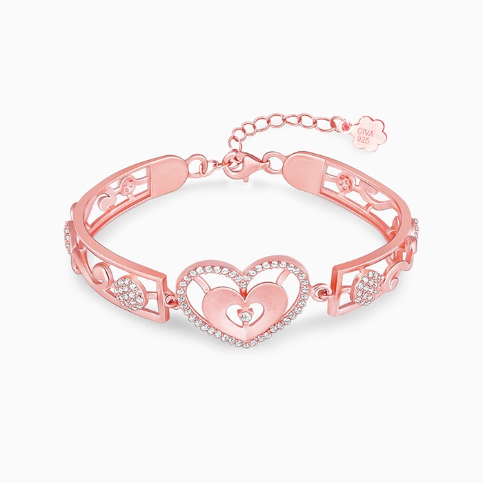 The Rose Gold Bracelet has a heart-shaped design as the centrepiece and a pattern on the body with a lobster claw clasp closure.