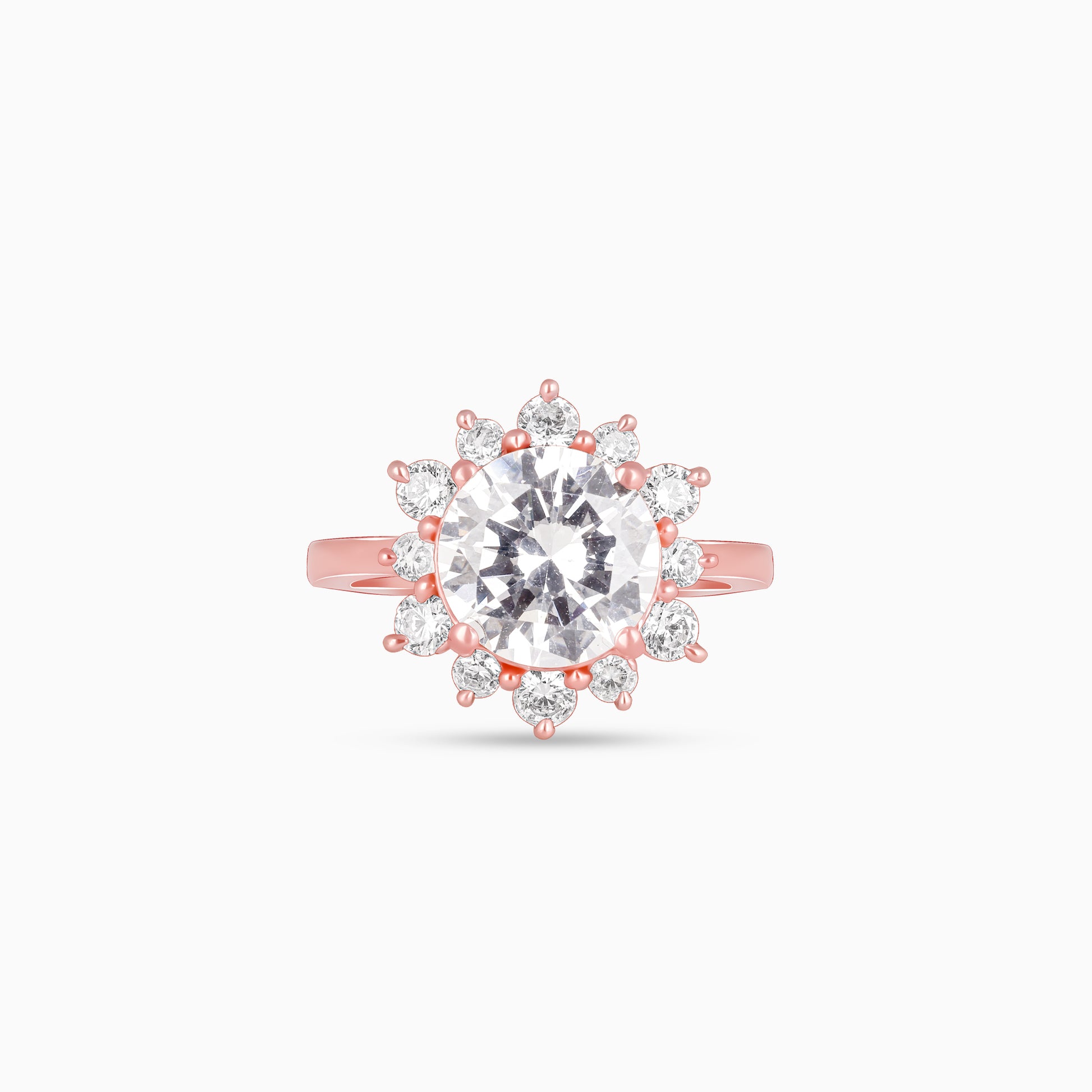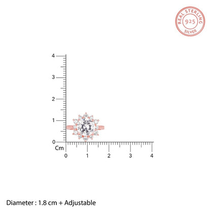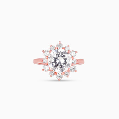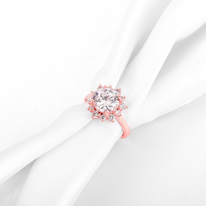 The Rose Gold ring has a floral design with a big zircon surrounded by smaller ones.