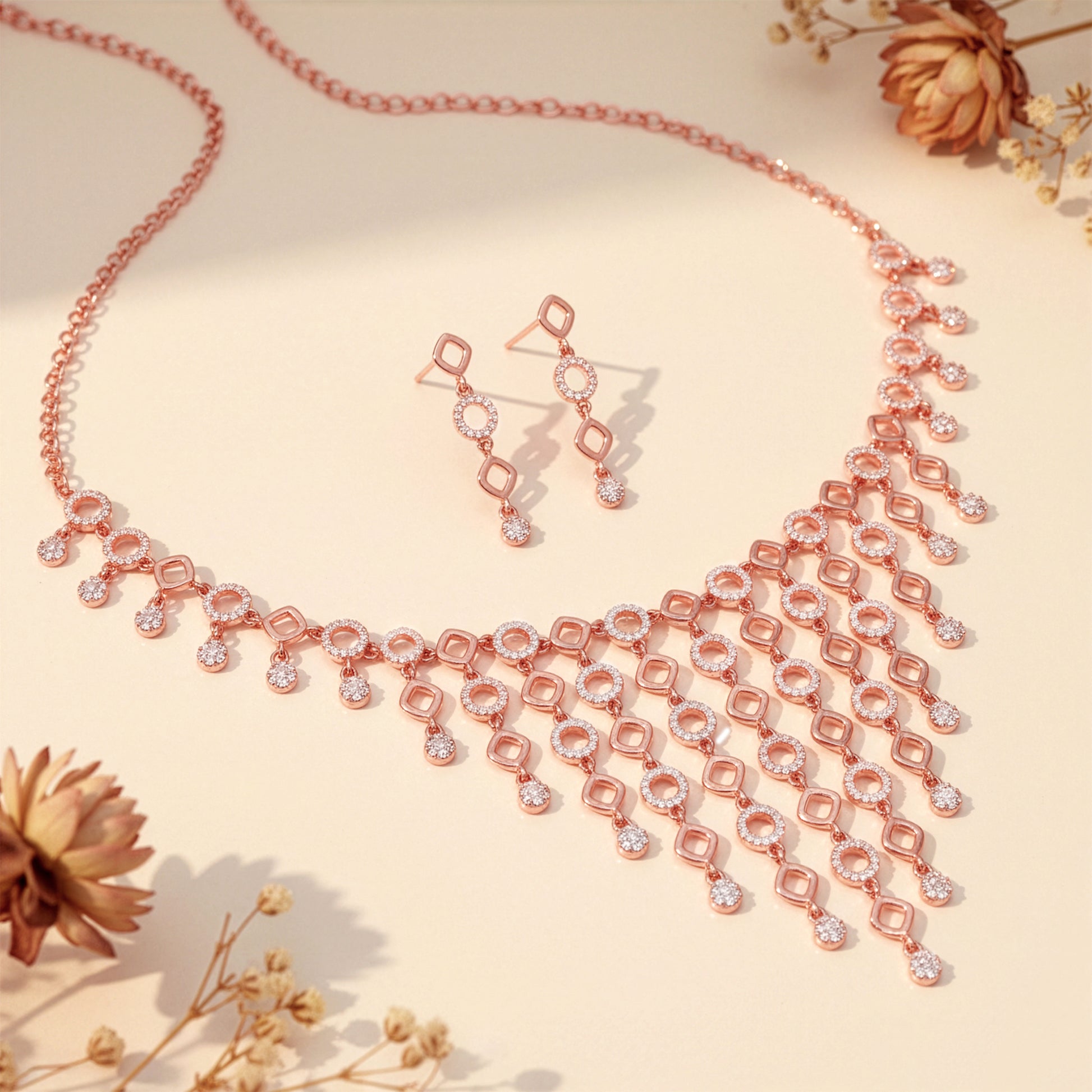 These rose gold earrings and necklace set has a gorgeous design with alternative circle and square motifs and circles studded with zircons and all motifs with small zircons hanging like mini chains at the bottom.