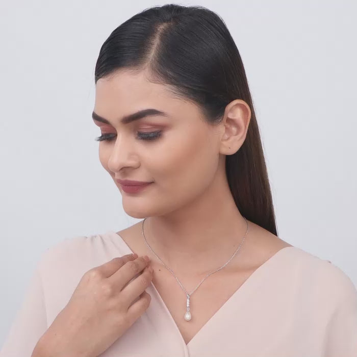 The Anushka Sharma Silver Drop of Pearl Pendant is inspired by the mysteries of the mighty ocean that hides beautiful pearls as a beautiful secret.