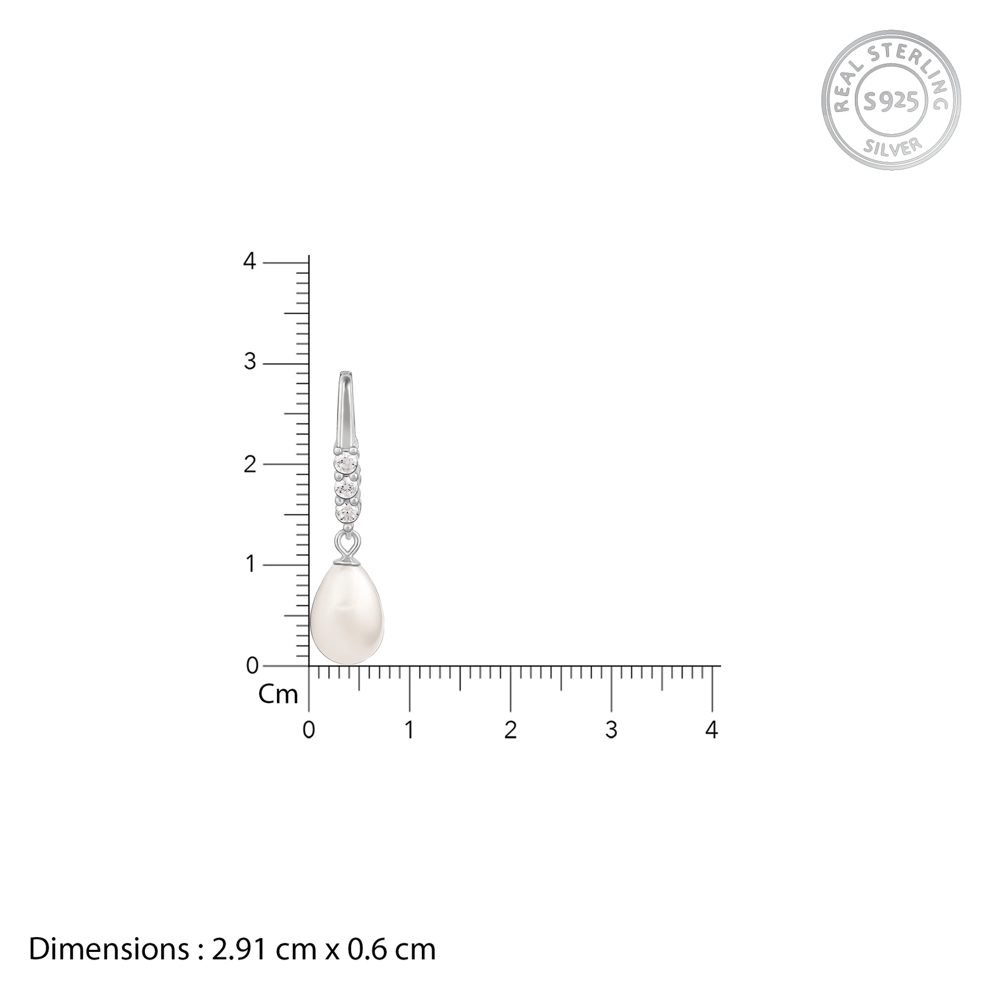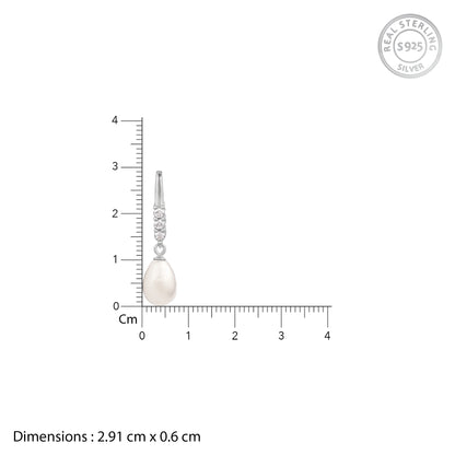 The Silver pendant has zircons arranged in a row and a pretty pearl dangling from them.