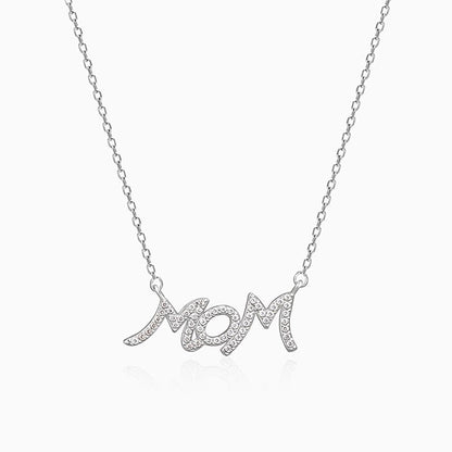 The Silver necklace has a typography design with the word MOM with a silver link chain.
