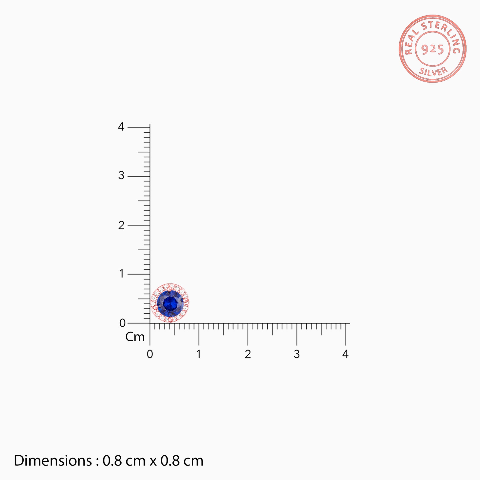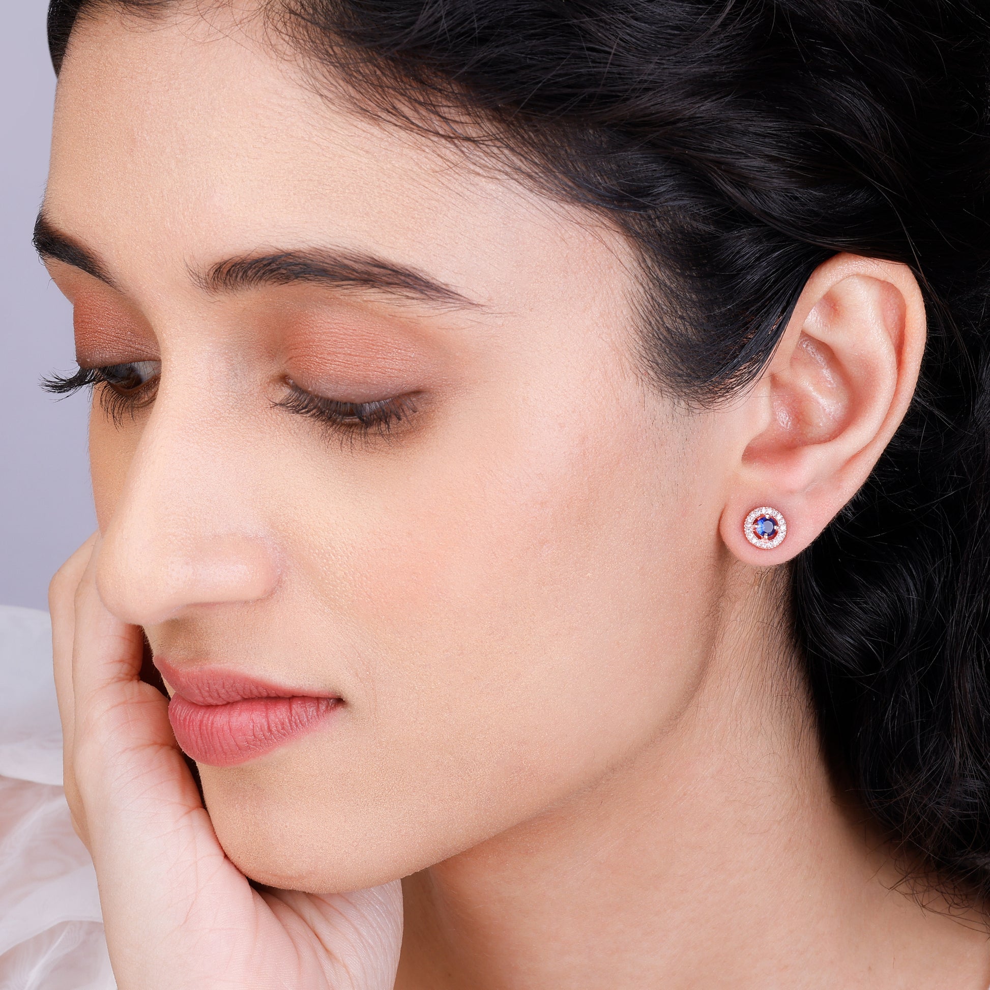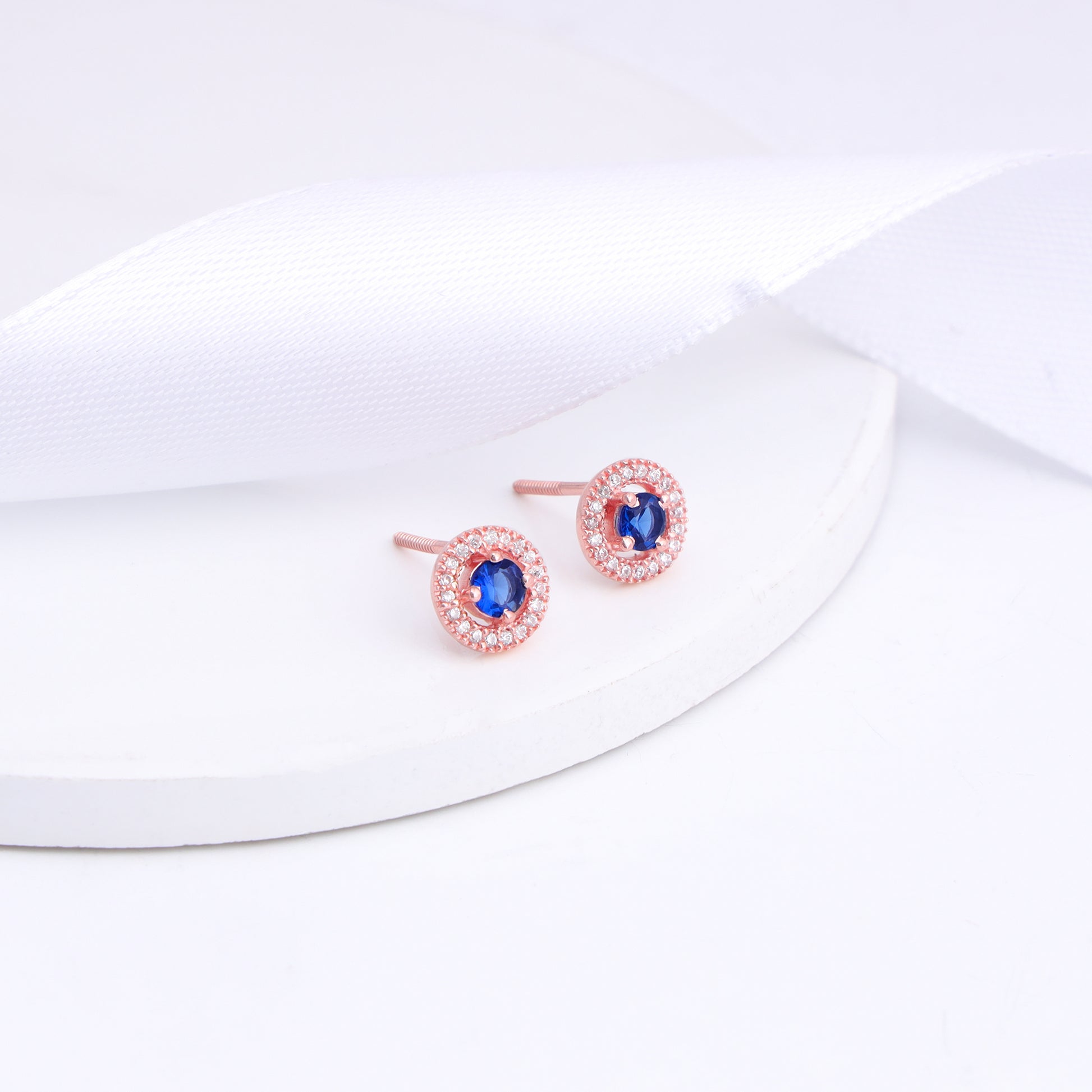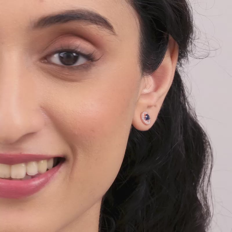 The Rose Gold Blue Velvet Studs have a dark blue stone encircled by zircons.
