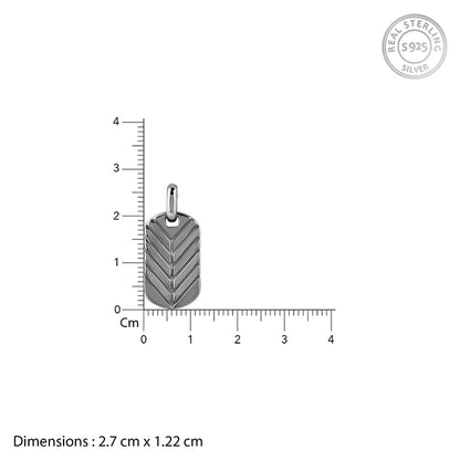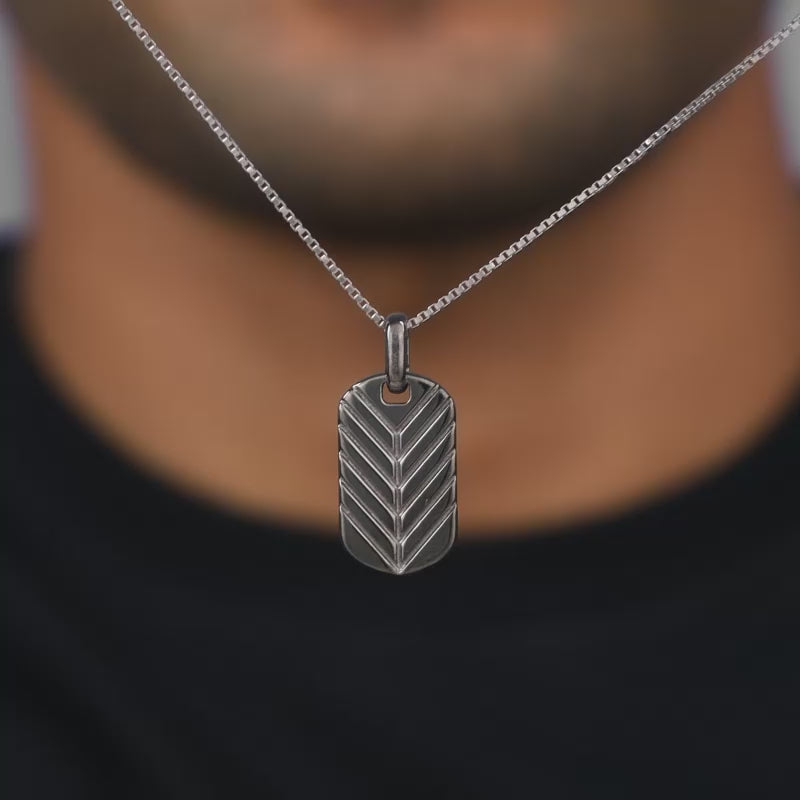 This black rhodium men's pendant with a box chain features a rectangular design with chevron engravings.