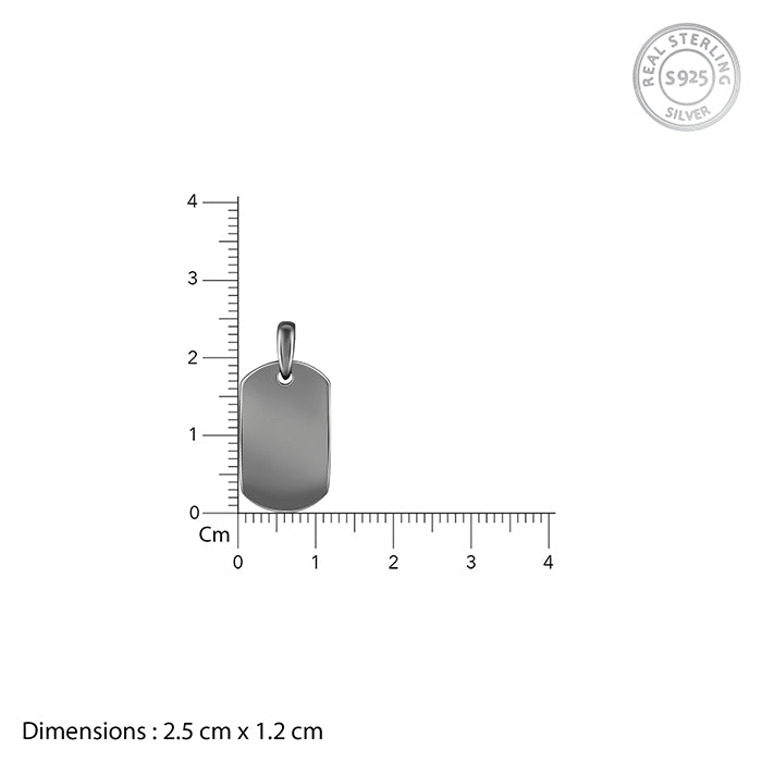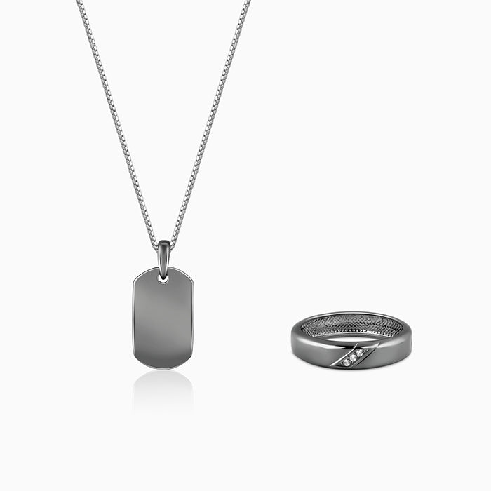 This black rhodium set for men includes a ring and a pendant with a box chain. The ring features a classic design with a central zircon. The pendant for men features a bold dog tag motif.
