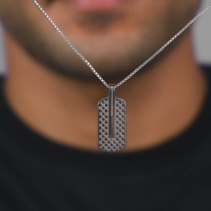 This black rhodium men's pendant with box chain features a rectangular shape with an engraved dotted pattern.