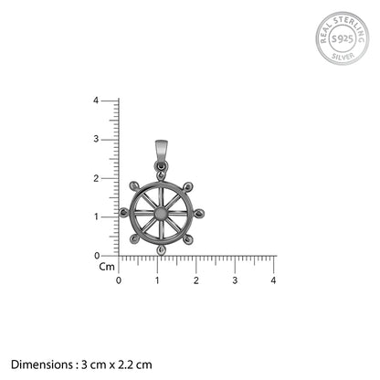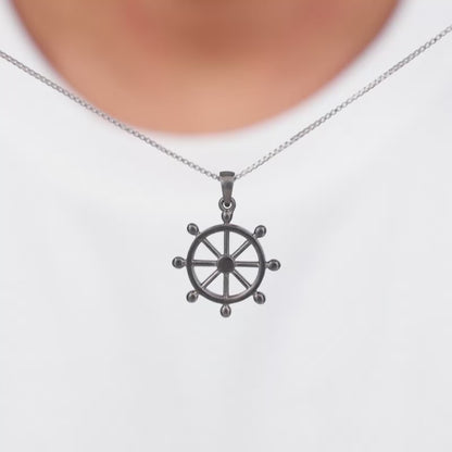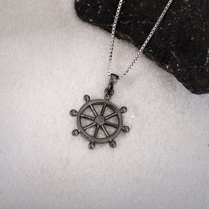 This mens black rhodium pendant with a box chain features a classic wheel shape.