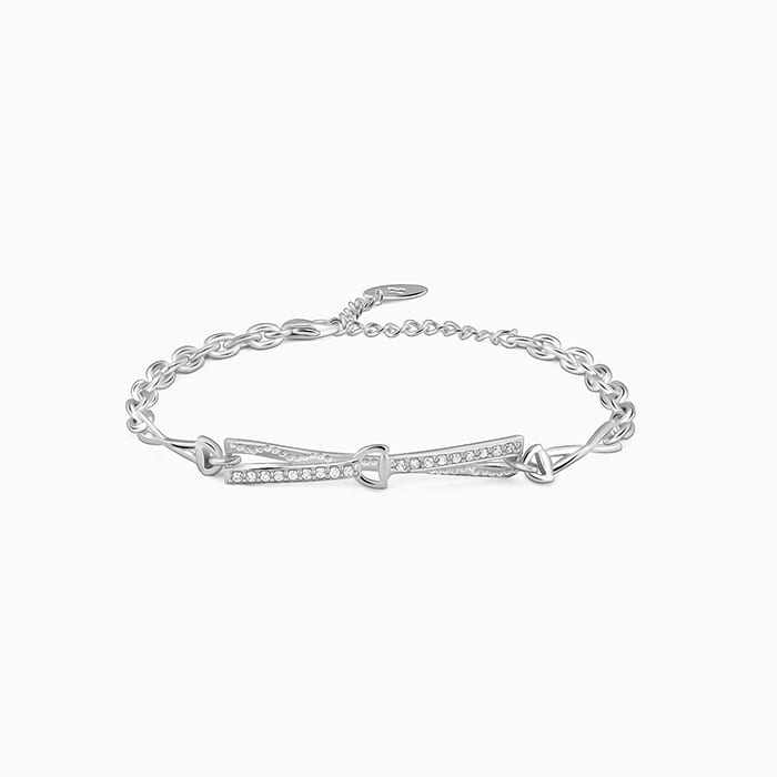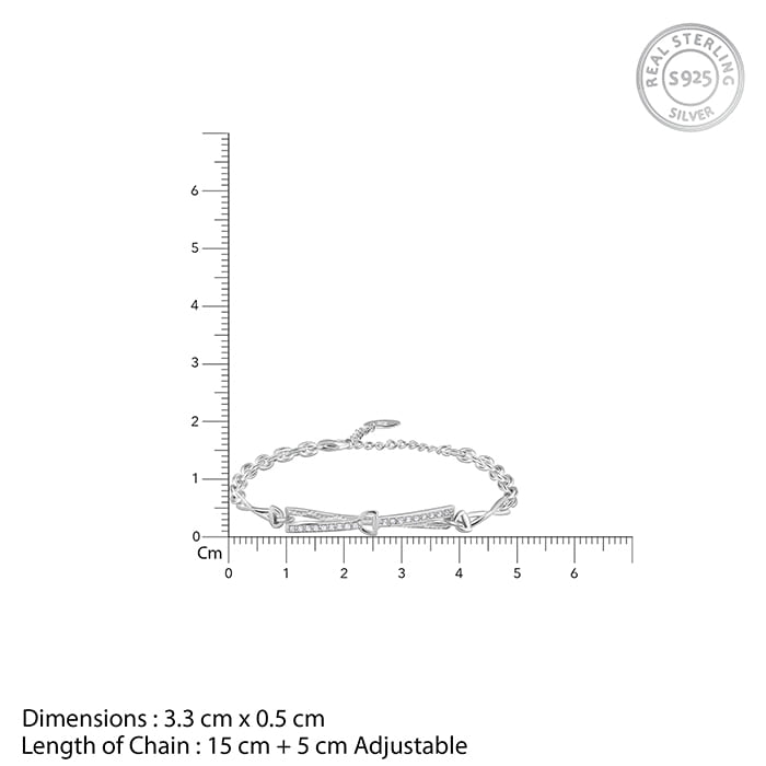 This silver bracelet has a centre design featuring two intersecting bars with zircons set within.