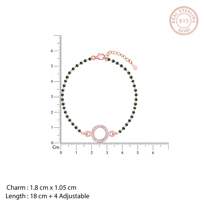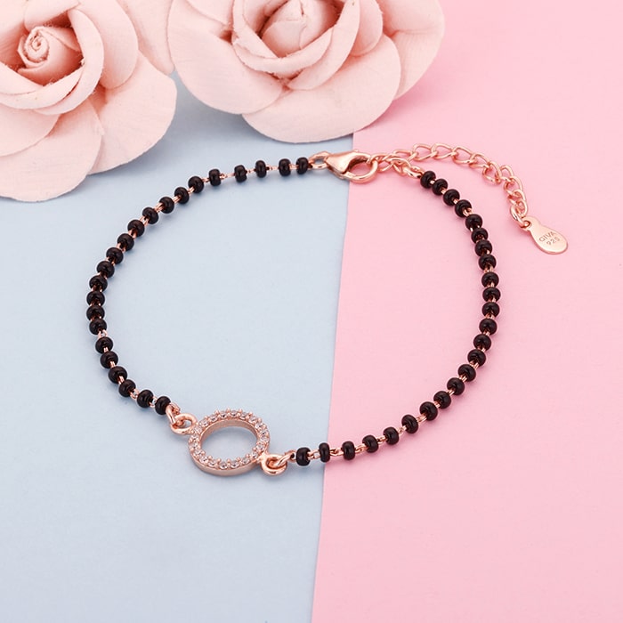 The rose gold mangalsutra bracelet has a hollow round shape with zircons studded on it.