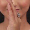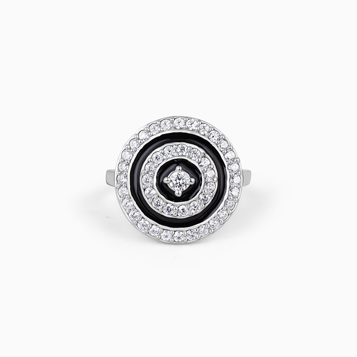 These oxidised silver rings boast a stunning dual-layer circle design with zircon accents, a prominent central zircon, and elegant enamel detailing.
