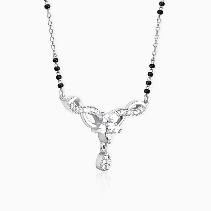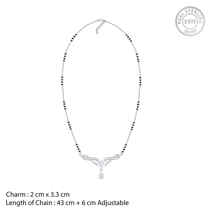 The Silver Sacred Love Mangalsutra has an elegant design with a floral drop in the centre, studded with zircons and accompanied by black beads.