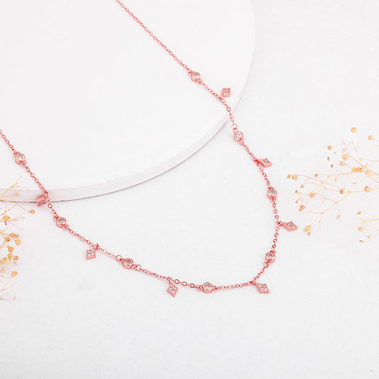 The rose gold necklace has cute dainty charms dangling on the necklace that is studded with zircons.