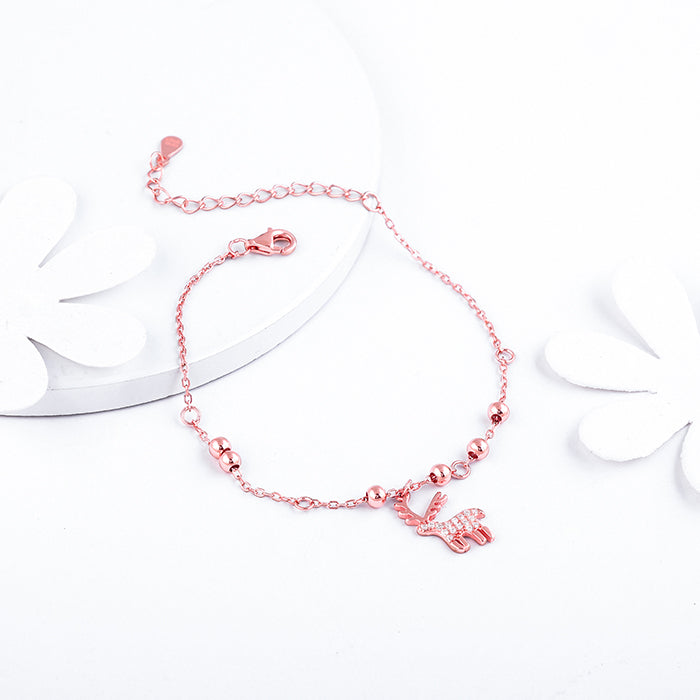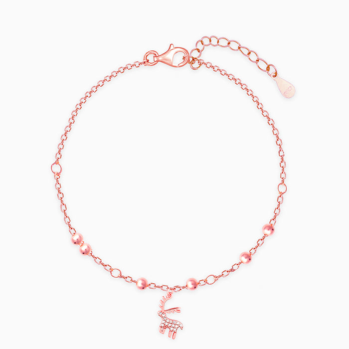 The rose gold bracelet has a reindeer charm studded with zircons which are dangling from its antlers.
