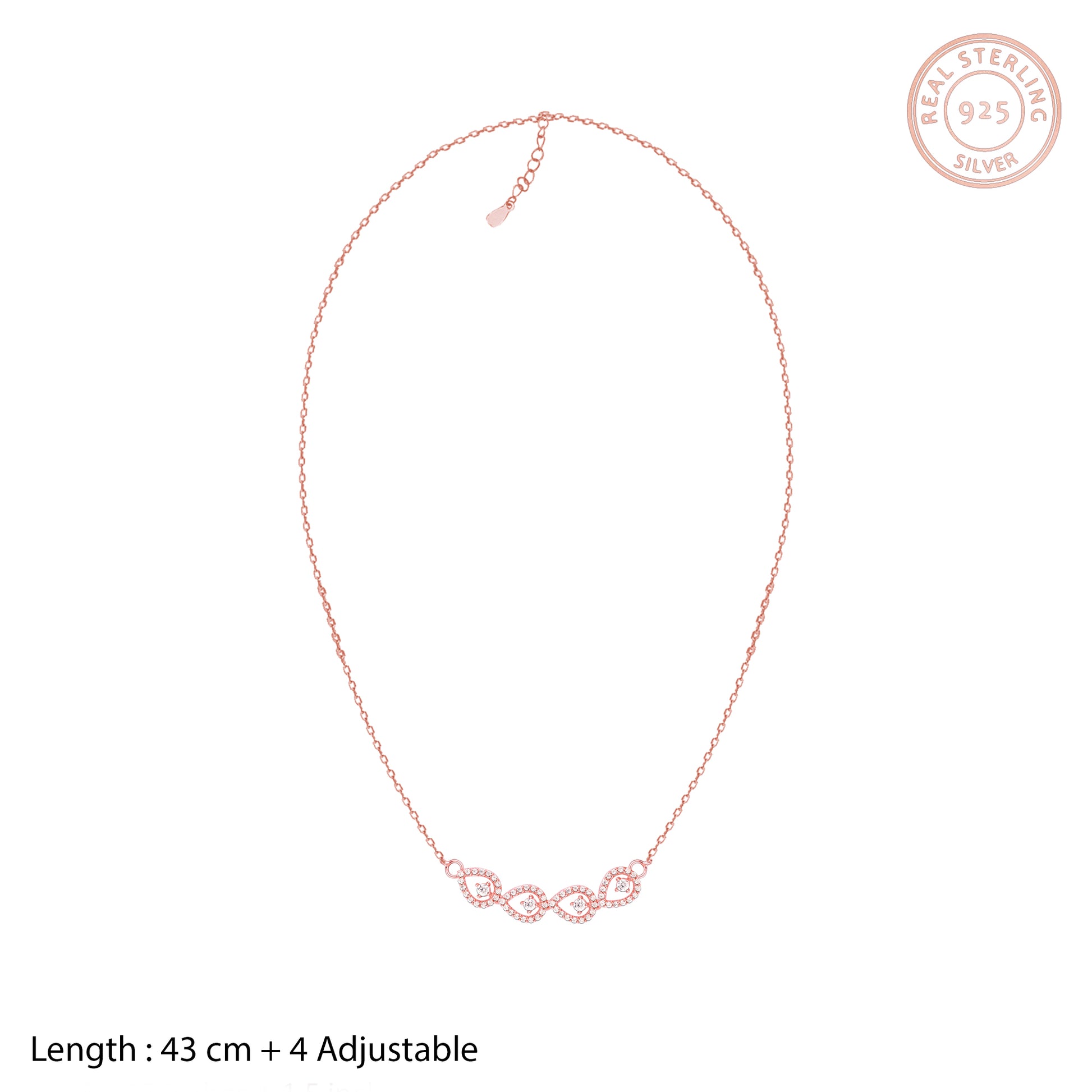 Shine with every step, this zircon-studded pear-shaped set of rose gold necklace and silver earrings turns elegance into your signature power.