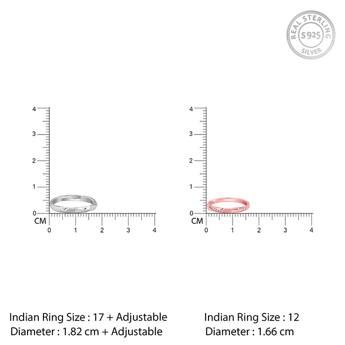 These silver and rose gold couple bands feature a silver male band with a twisted design and a rose gold female band with a matching twisted design, partially studded with zircons.