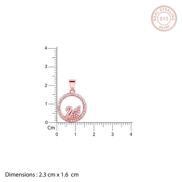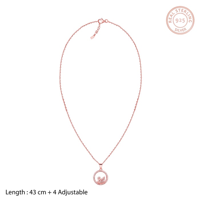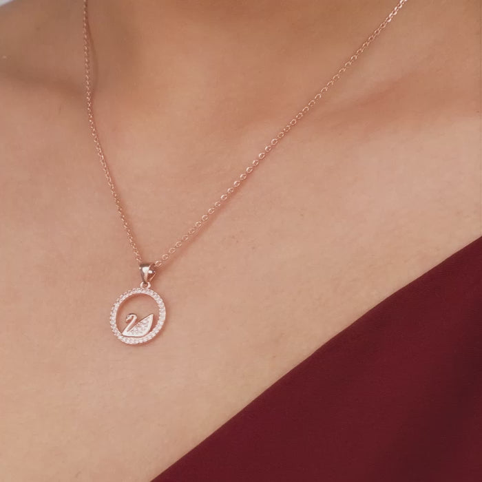 The rose gold pendant has a round frame studded with zircons and a swan charm inside it.