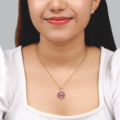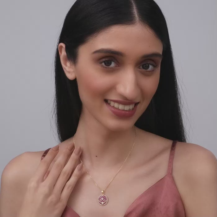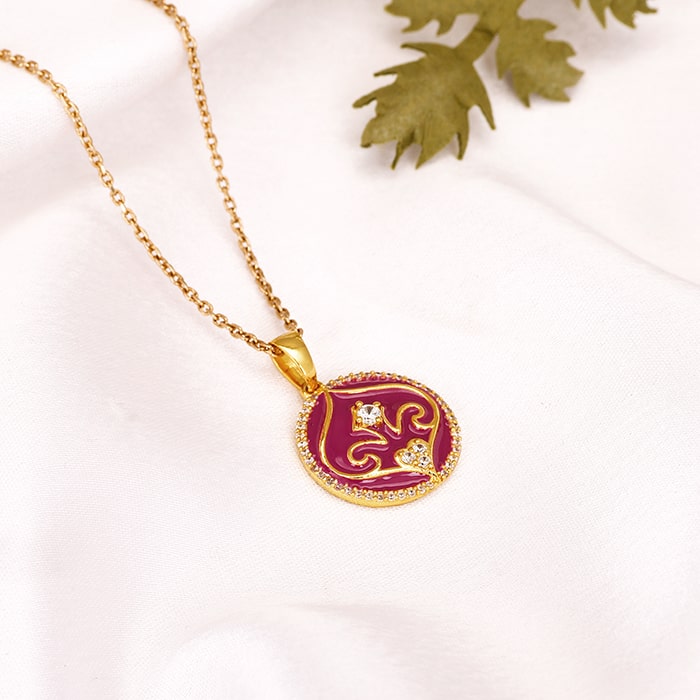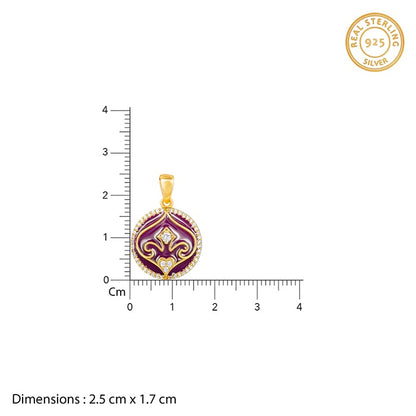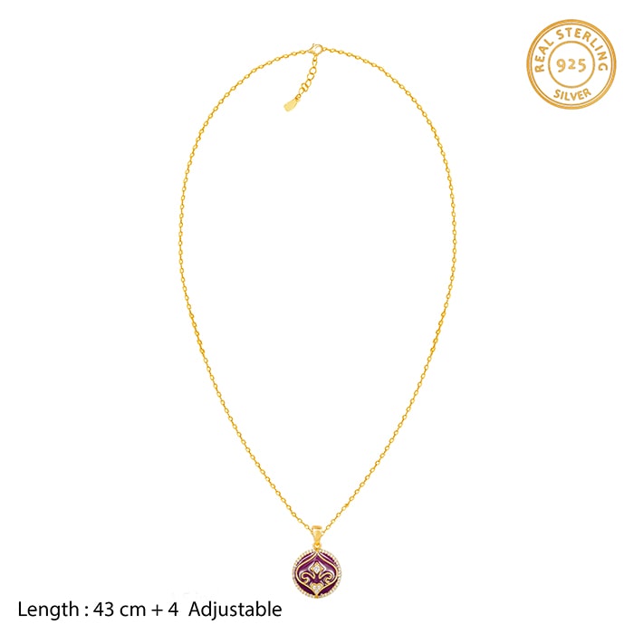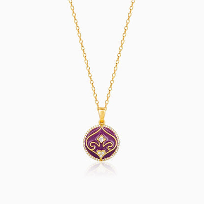 The golden pendant features a royal purple enamel motif, framed by sparkling zircons on a link chain. A stunning symbol of elegance and devotion.