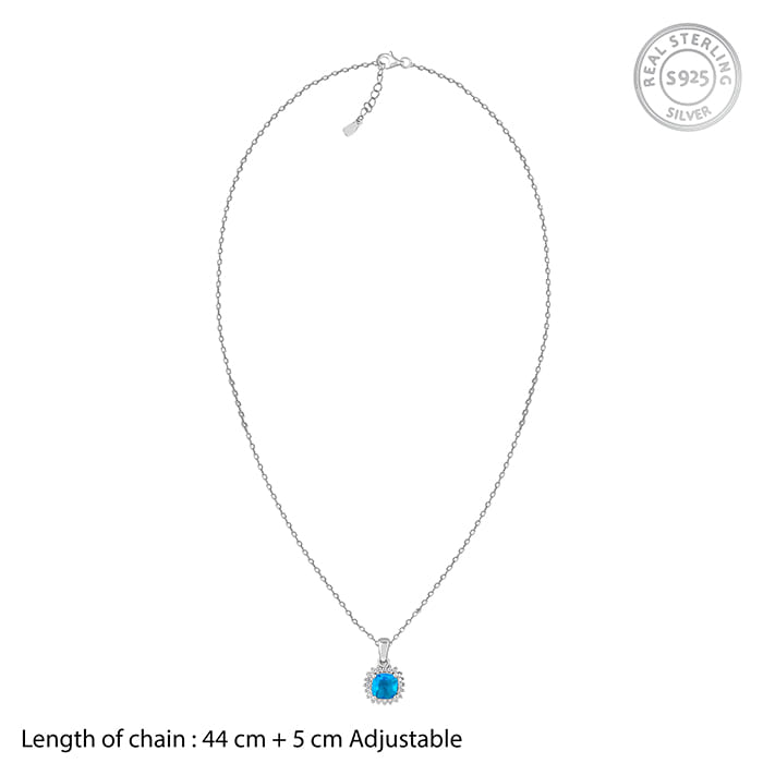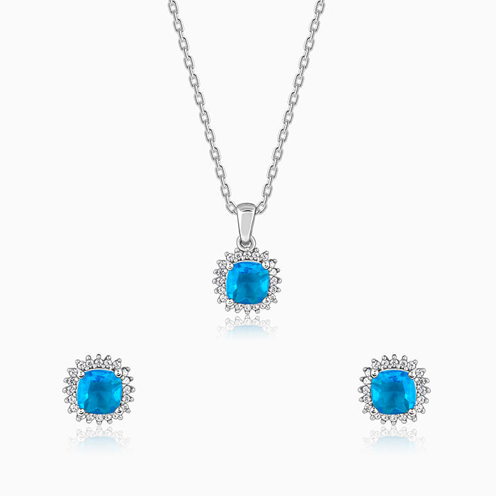 This silver set has a pendant with a link chain and a pair of earrings featuring a square motif with blue-coloured zircon at the centre and zircon studded around.