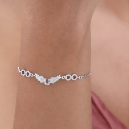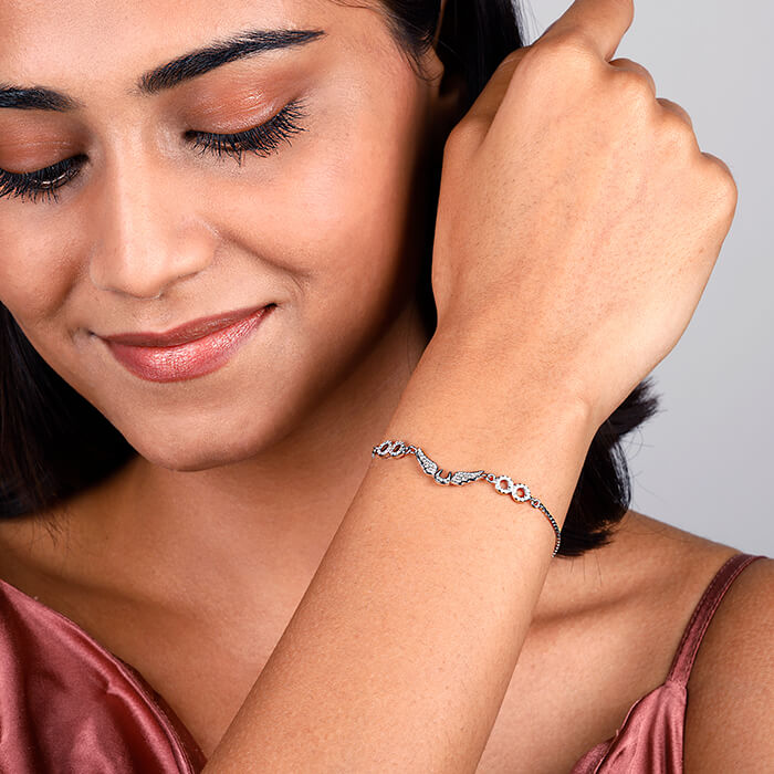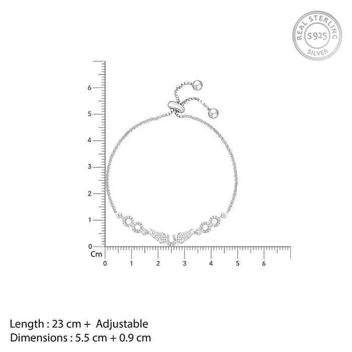 The silver bracelet has a unique design with zircons studded on the beautiful centrepiece.