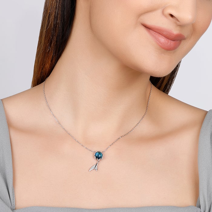 The silver necklace has a beautiful blue coloured stone placed on a round structure with a fishtail following the stone.