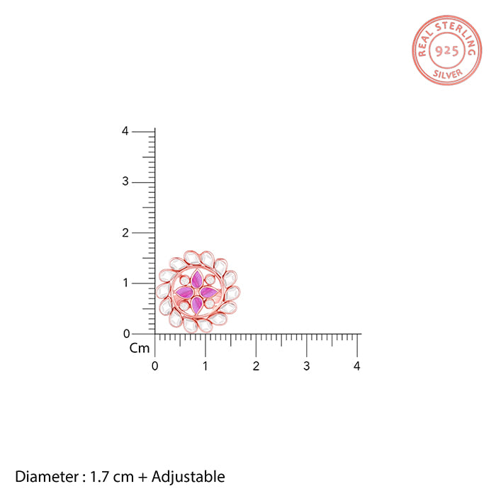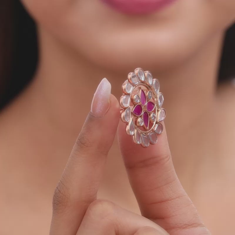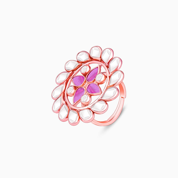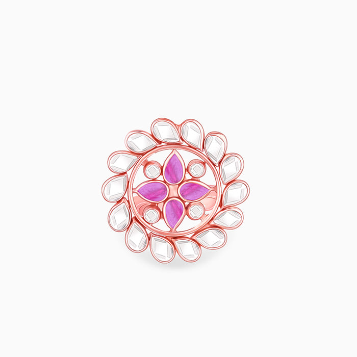 This rose gold ring has a flower motif studded with rose-cut glass stones and coloured stones. Presenting GIVA's chic #VivaahDaSwag Collection for an unforgettable wedding.