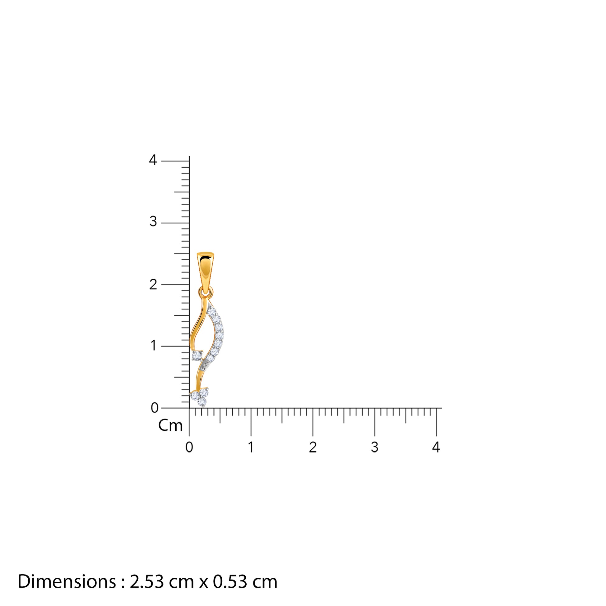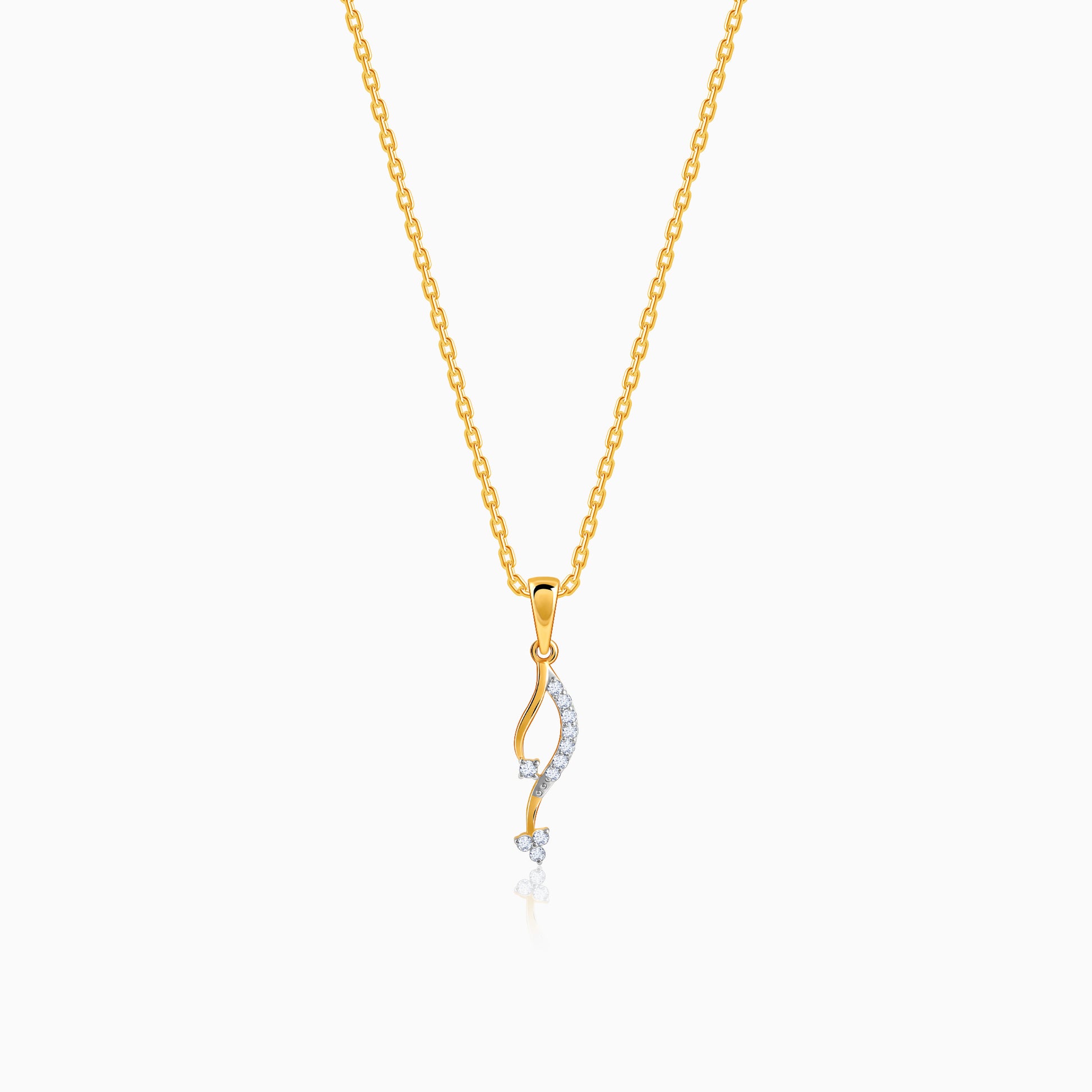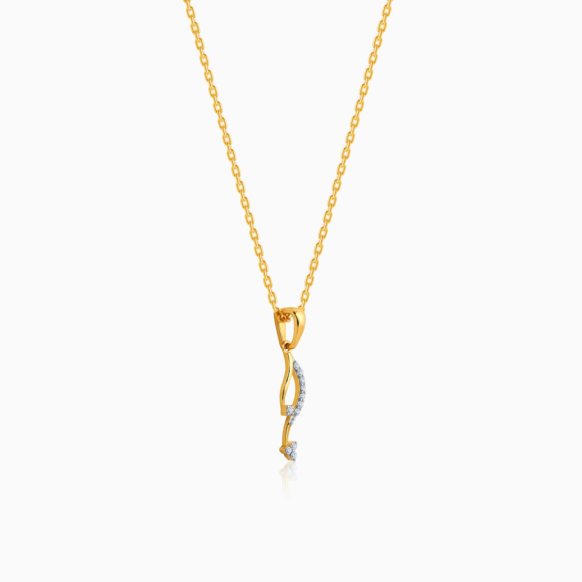 This beautiful pure gold pendant has a semi S-like shape. It is partially studded with lab-grown diamonds on one side which ends in a tiny-leaf like motif while the other side boasts a pure pure gold shine. The two curved shapes are joined by a single diamond.