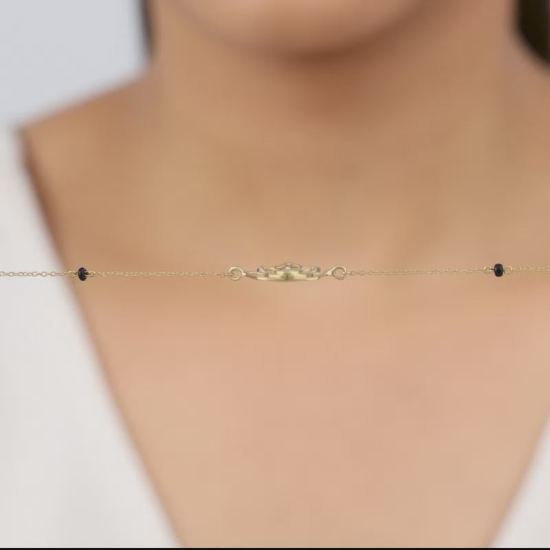 This bracelet has a lovely lotus motif with a lab-grown diamond placed at the centre, and black beads are positioned on both sides of the chain.