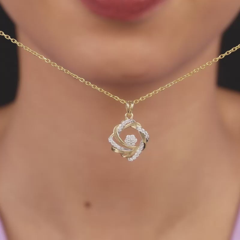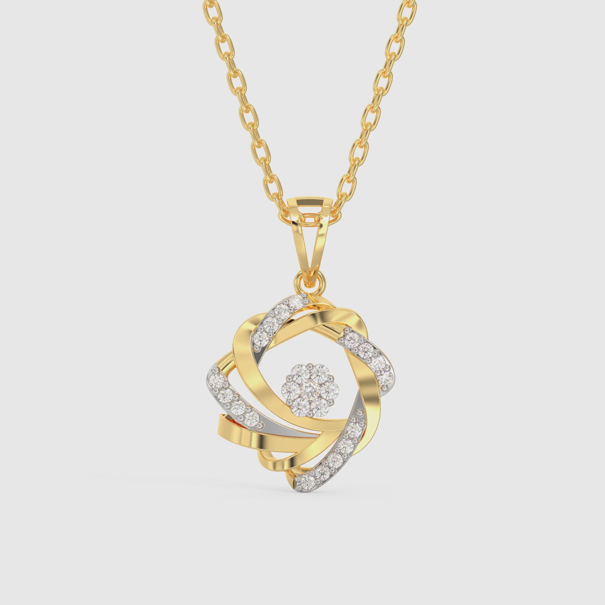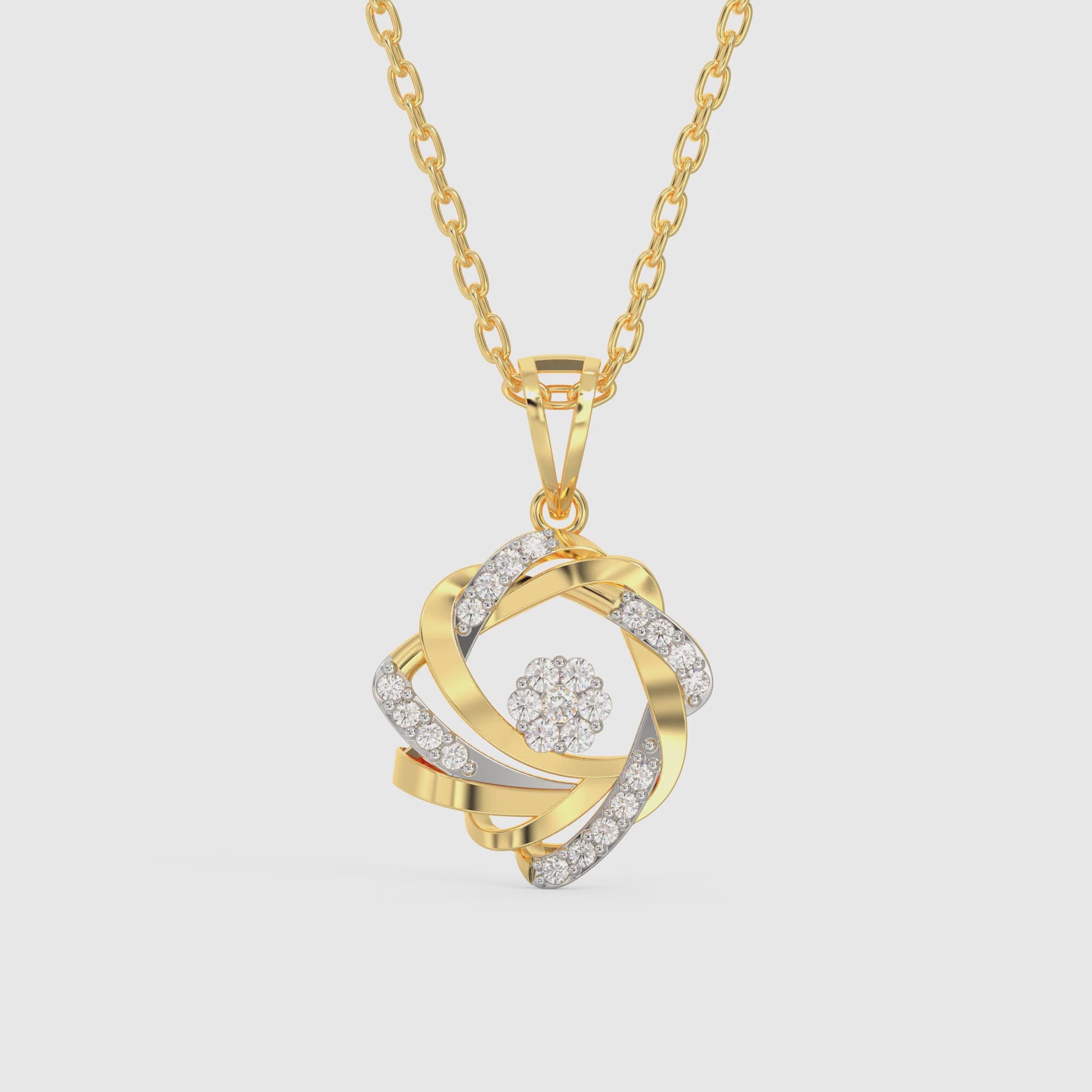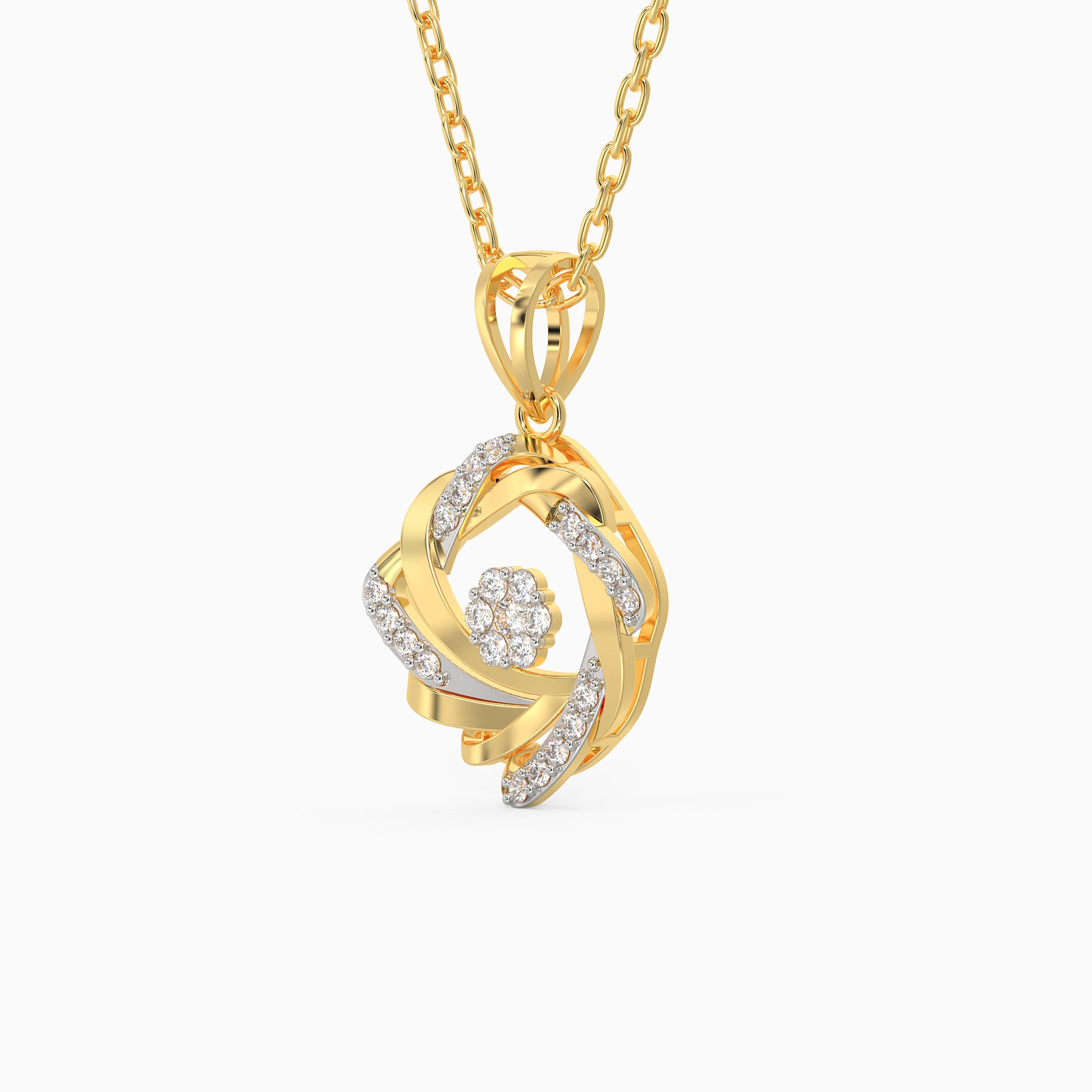 This pendant has a beautiful design featuring a flower motif at the centre surrounded by diagonal interlaced waves of gold and diamonds.
