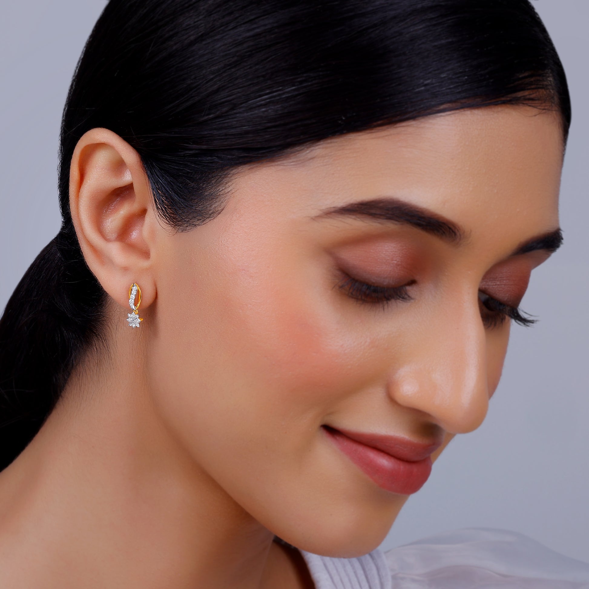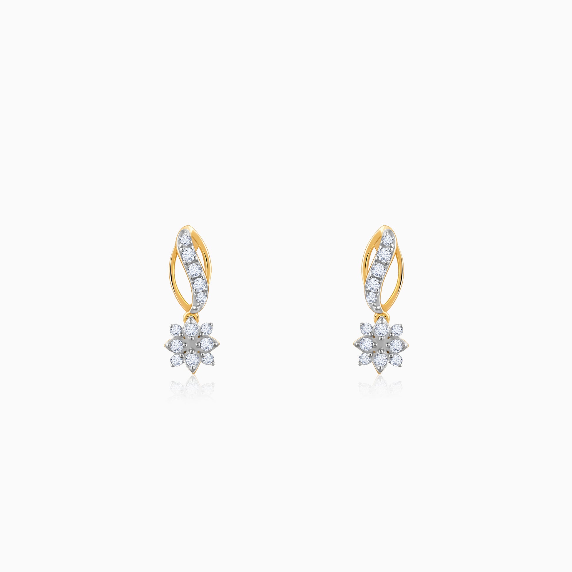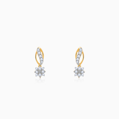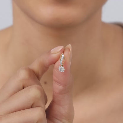 These pure gold earrings feature a flower motif, studded with sparkling lab grown diamonds, and are suspended from a graceful, curved stem.