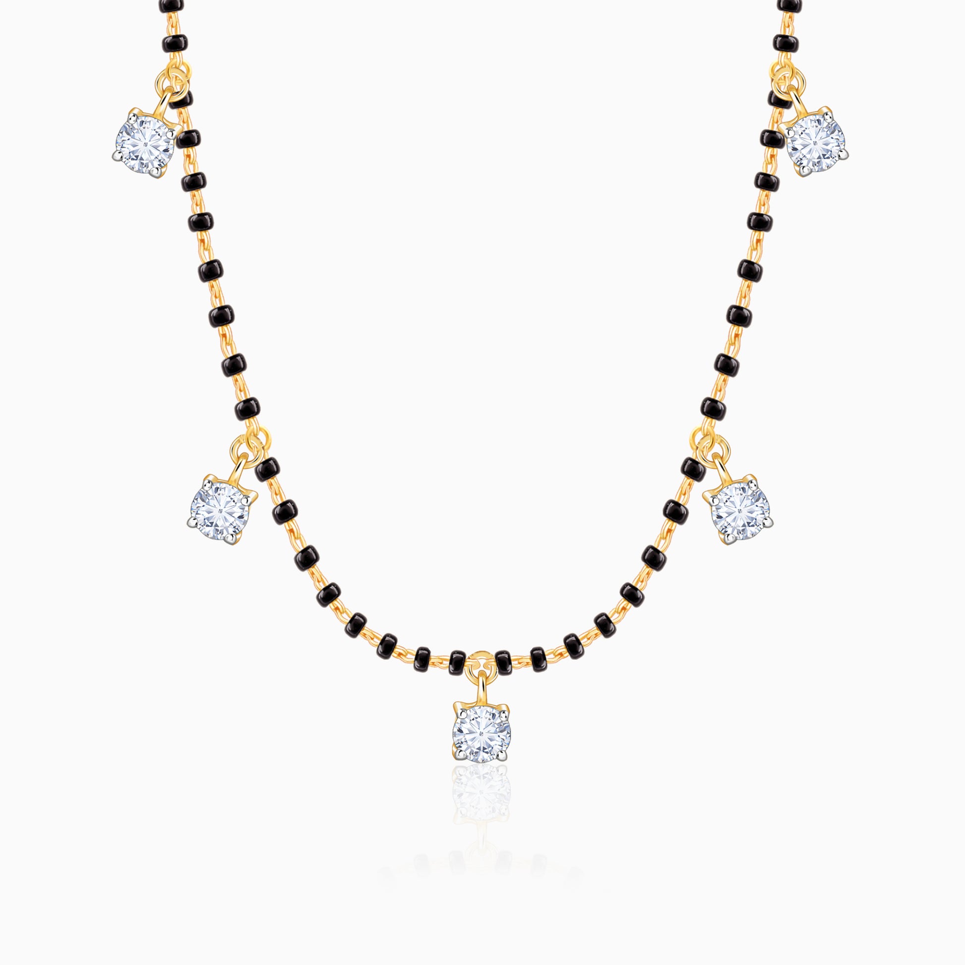 This pure gold mangalsutra for women features black beads along the chain, accented with evenly spaced dangling lab grown diamonds.