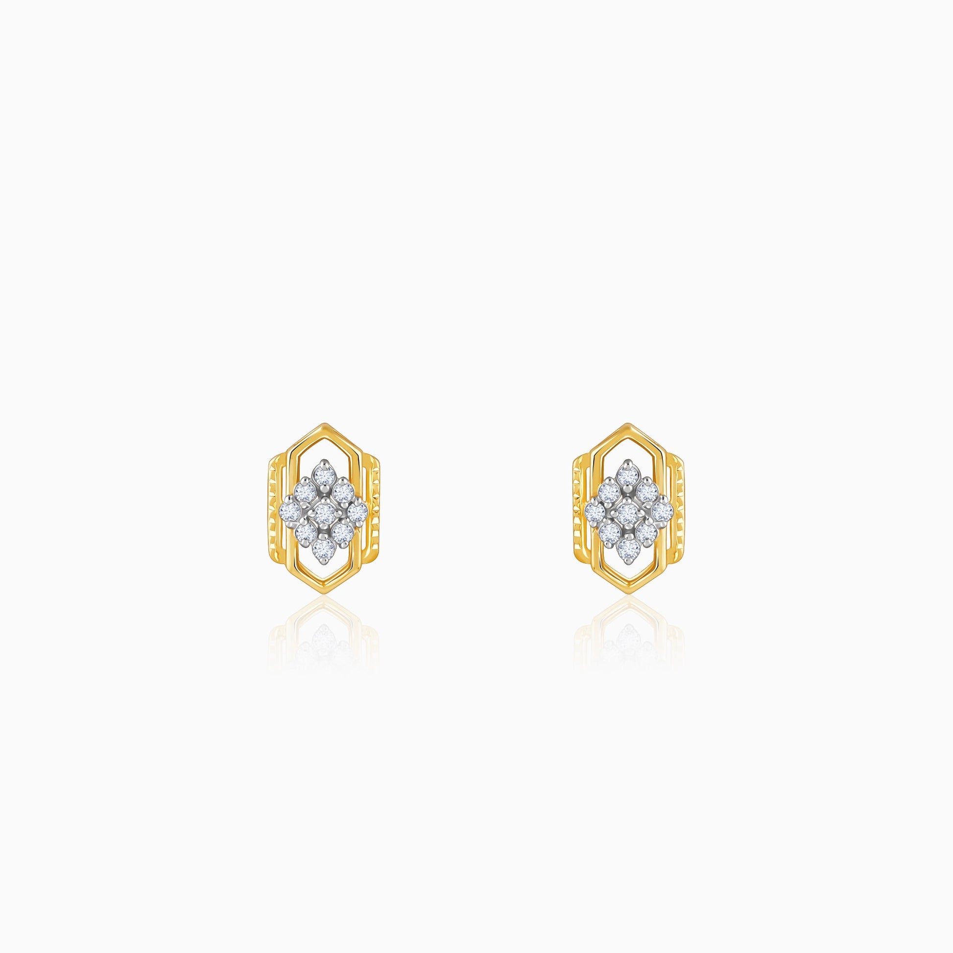 This design captures the timeless allure of structured patterns blended with the brilliance of lab diamonds. Perfect for those who love a touch of modern elegance rooted in tradition. These gold earrings feature a hexagon-inspired frame with intricate detailing. At the centre holds a floral lab grown diamond cluster. Try the exquisite lab grown diamond jewellery from Heer By GIVA today.