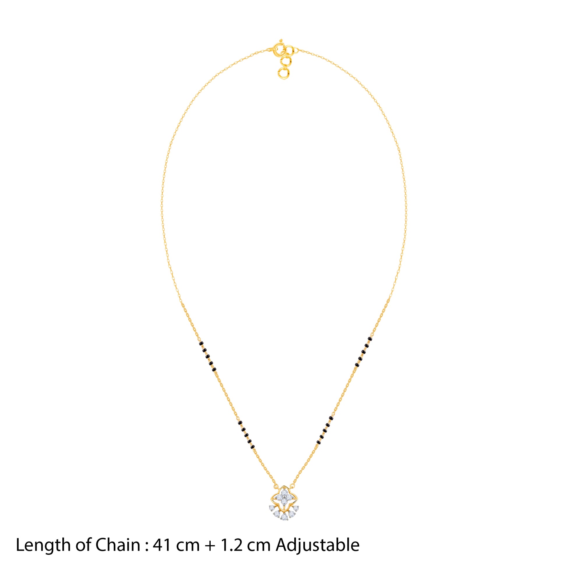 This gold mangalsutra for women features a floral pendant studded with lab grown diamonds. Also paired with classic black beads for timeless elegance.
