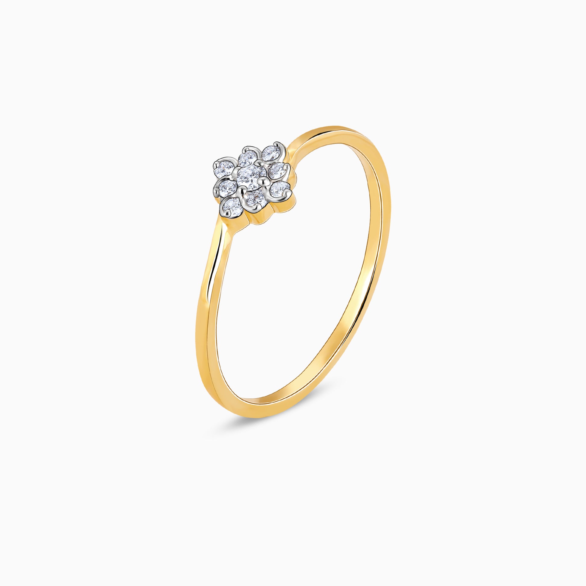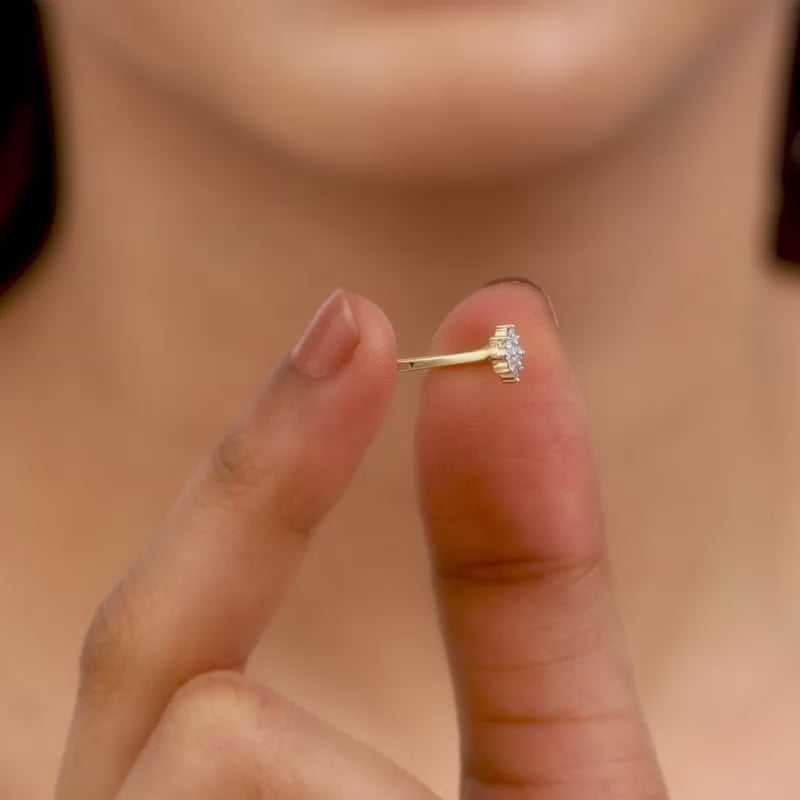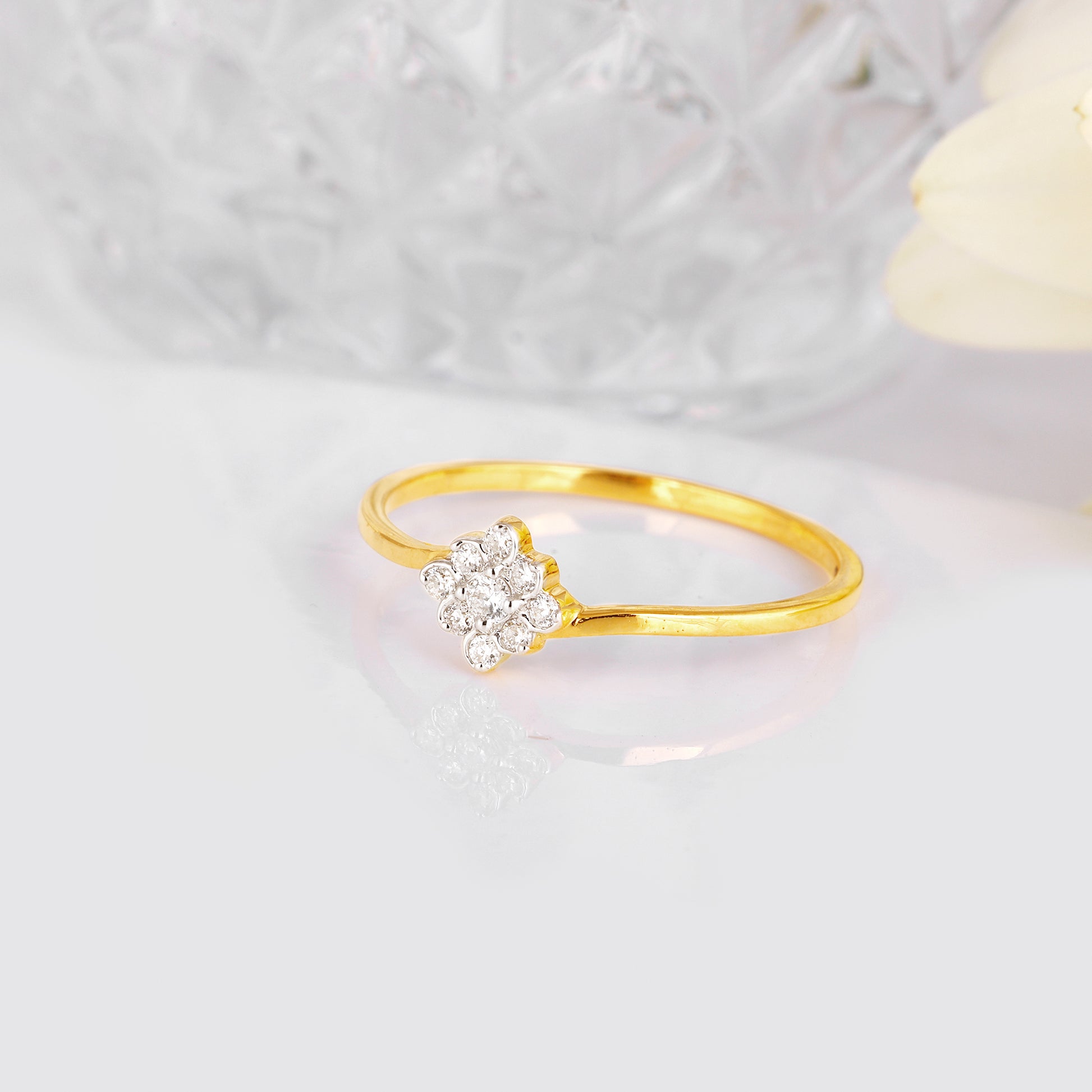 This gold ring has a rhombus shape motif studded with lab-grown diamonds.