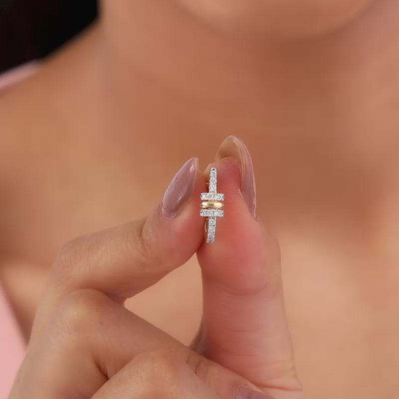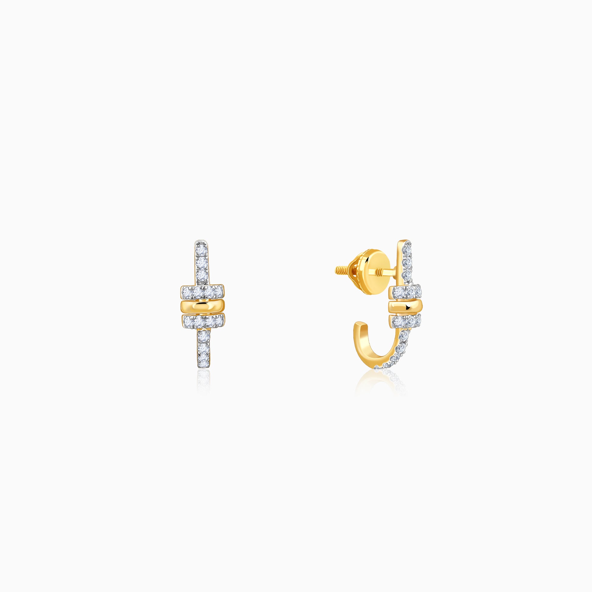 These pure gold earrings for women feature a linear arrangement of lab grown diamonds. The design incorporates both straight and circular sections, creating a structured yet decorative piece.