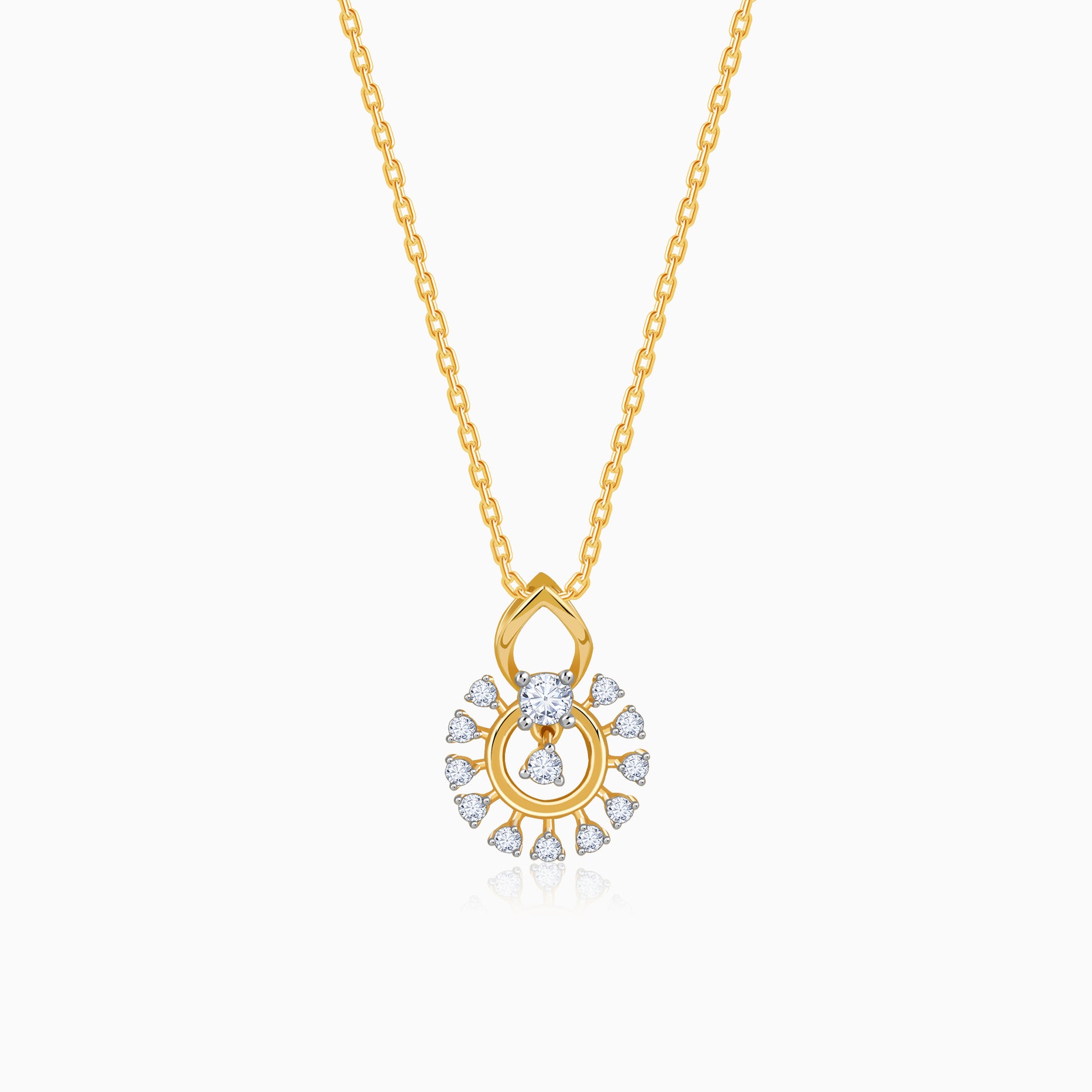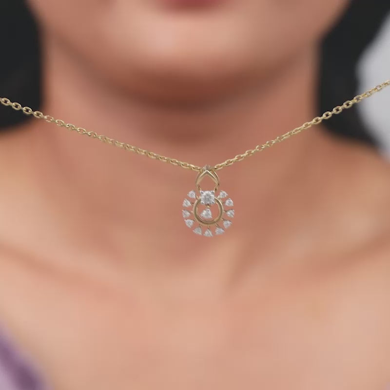This gold pendant for women features a concentric design with a central lab grown diamond encircled by a halo of smaller lab grown diamonds. Suspended from a teardrop-shaped bail, the piece adds a refined touch to its elegant circular form.