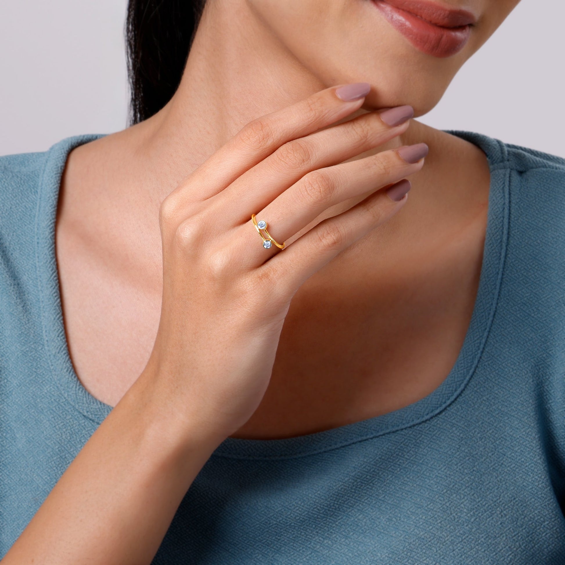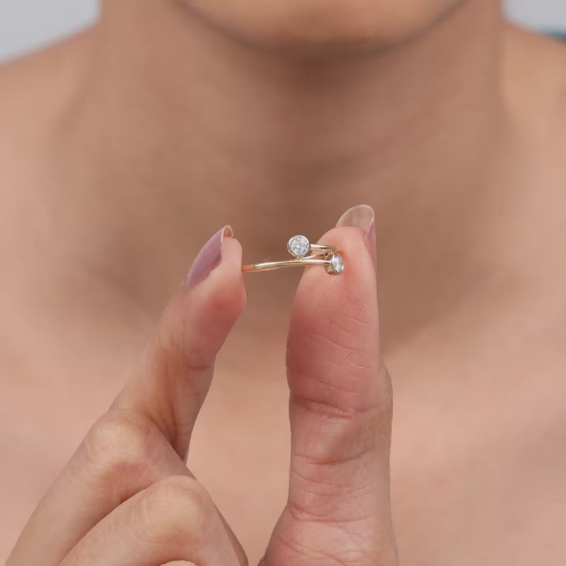 This pure gold ring for women showcases a bypass design. The ends of the bands are set with two bezel-set lab grown diamonds, creating a sleek and minimalist look.