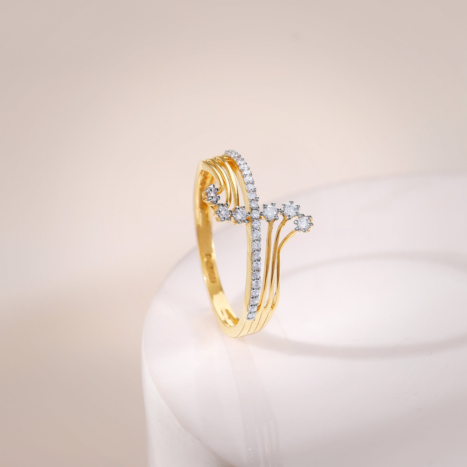 This pure rose gold ring for women features a unique split shank design studded with lab grown diamonds.