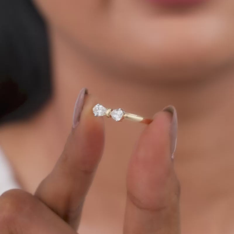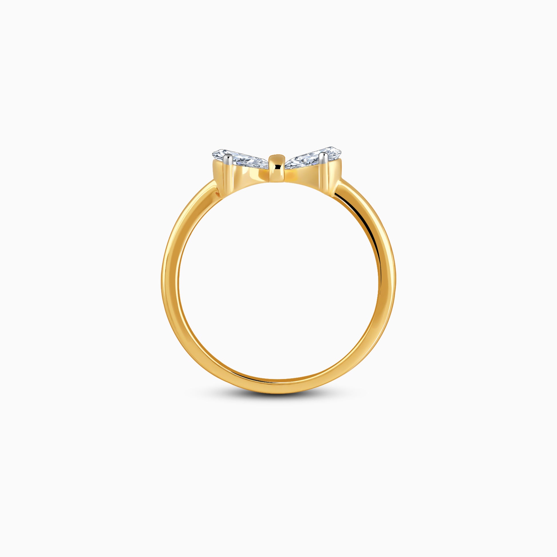 This pure gold ring features two pear-cut lab grown diamonds facing outward, joined by a polished bow-tie on a sleek yellow band.