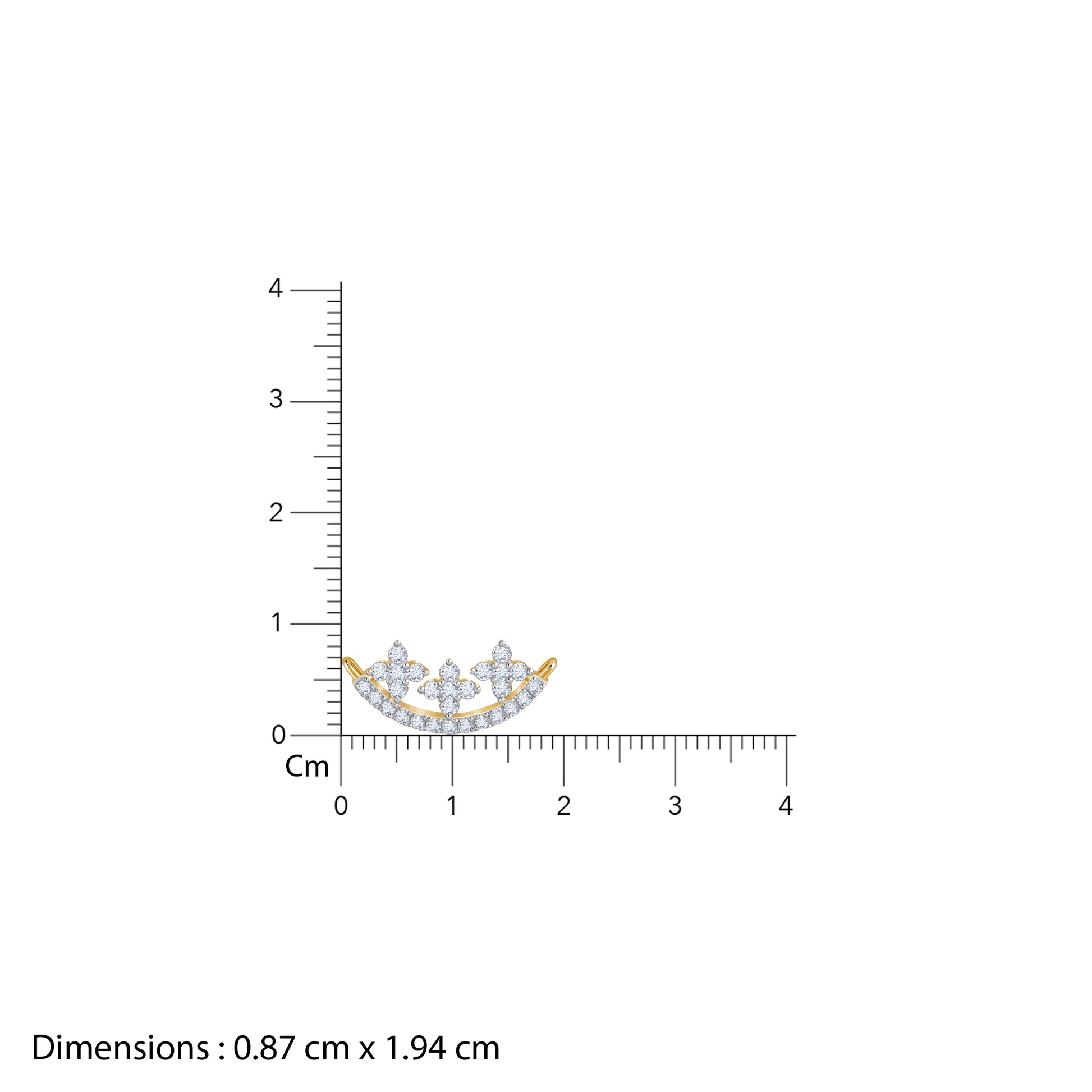 This pure gold mangalsutra for women showcases a U-shaped design with flower-inspired motifs. The motif is entirely studded with lab grown diamonds. The chain is strung with black beads.