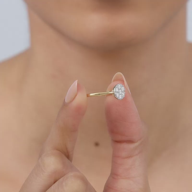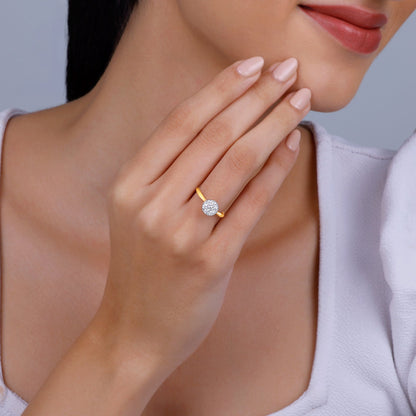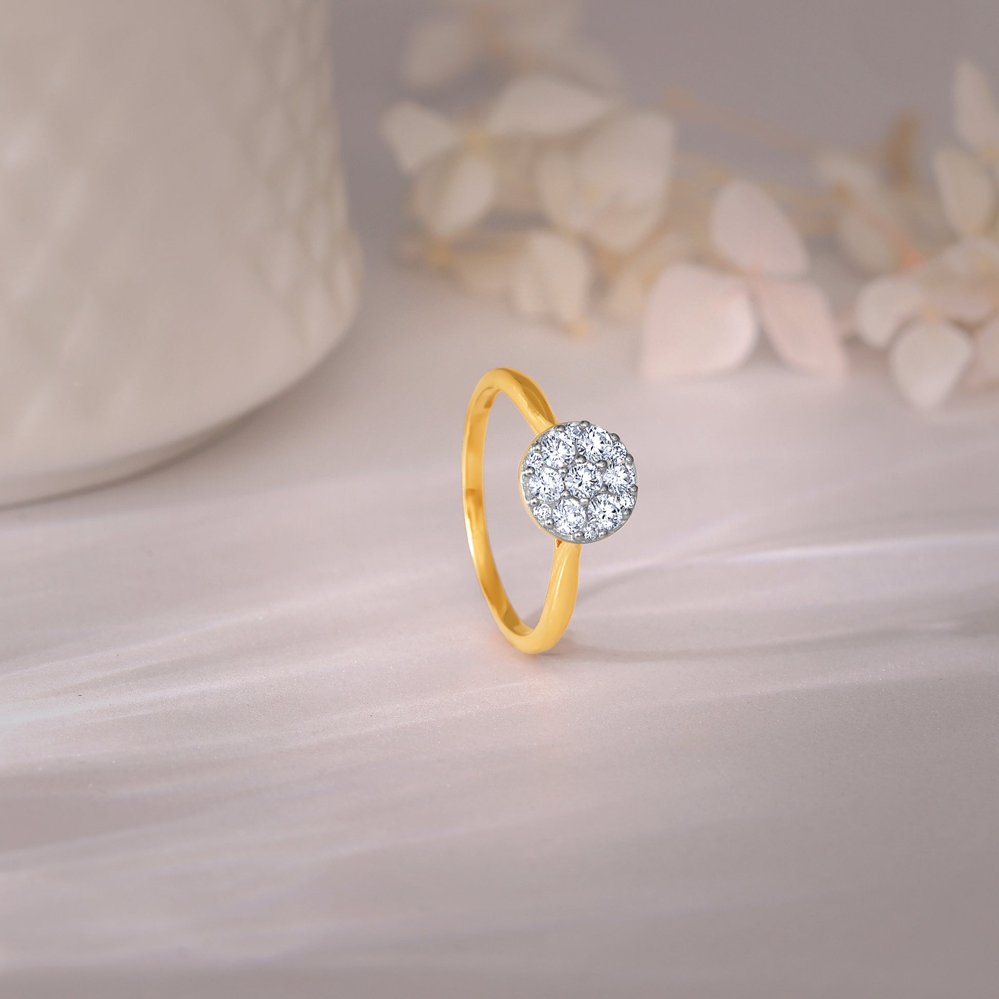 This pure gold ring has a sleek band and a round motif on the head studded with lab grown diamonds.