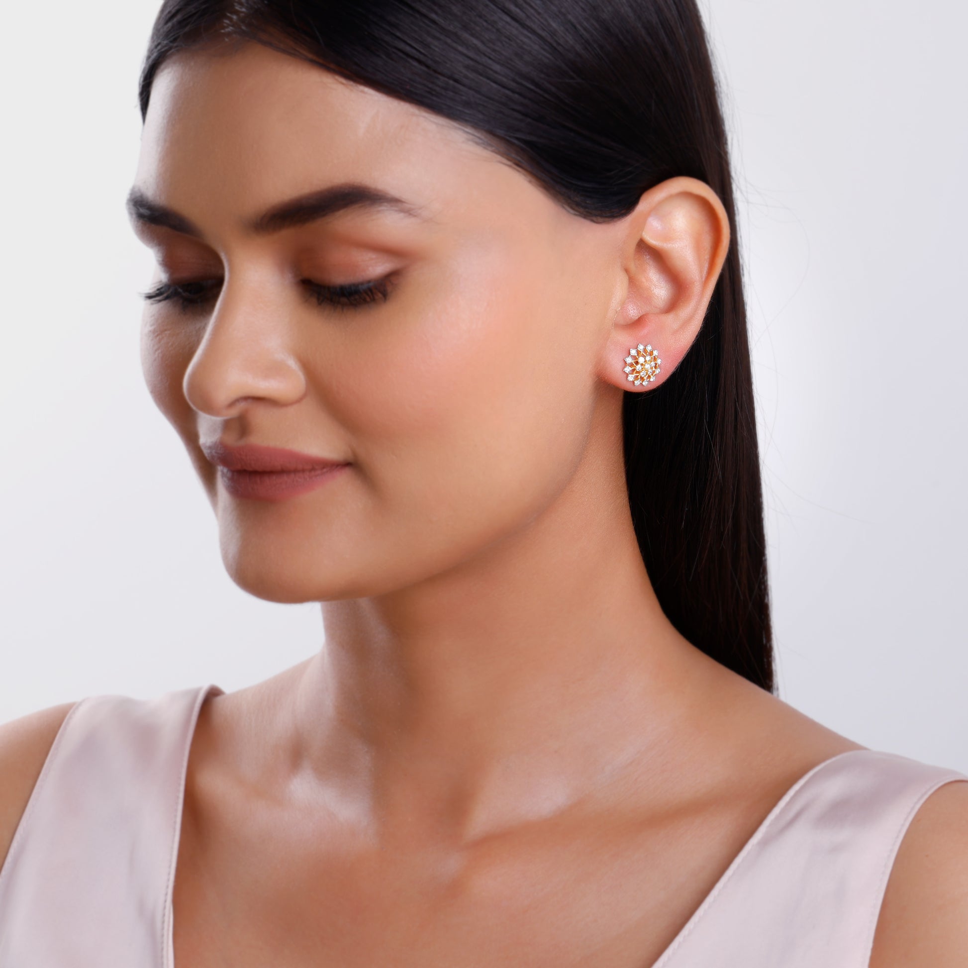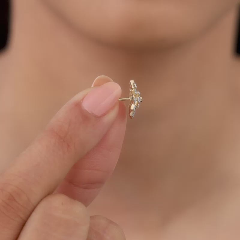These pure gold earrings for women feature a cluster of lab grown diamonds arranged in a starburst motif.